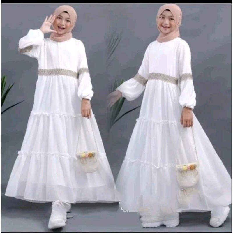Baju Gamis Anak Putih Perempuan Usia 4-13 Tahun Variasi Renda Bahan Crinkle Airflow Terbaru Kekinian