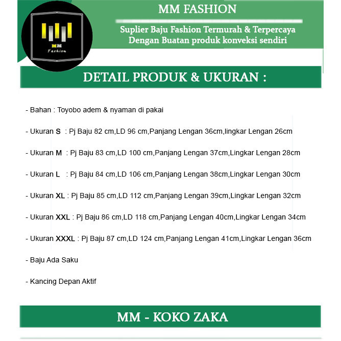 Koko Zaka Lengan 3/4 - MM Fashion (MM) - Ukuran S-3XL - Matt Katun Toyobo - Baju Koko atasan Pria