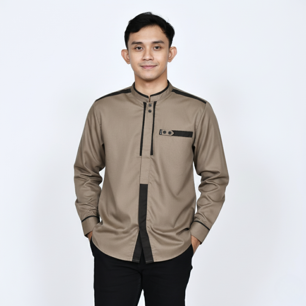 Baju Koko Pria Dewasa Lengan Panjang Warna Coklat Motif Katulistiwa Elrumi Katun
