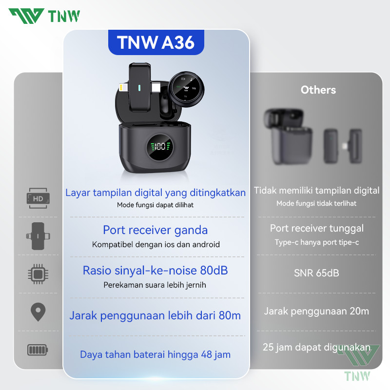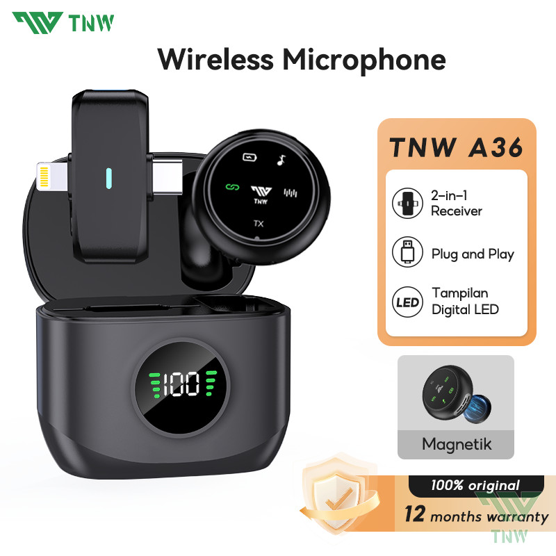 TNW A36 2-In-1 Wireless Microphone Magnetic Clip-On Microphone Dual Lavalier Mikrofon Plug & Play With Charging Case Untuk Perekaman Video dengan Ponsel