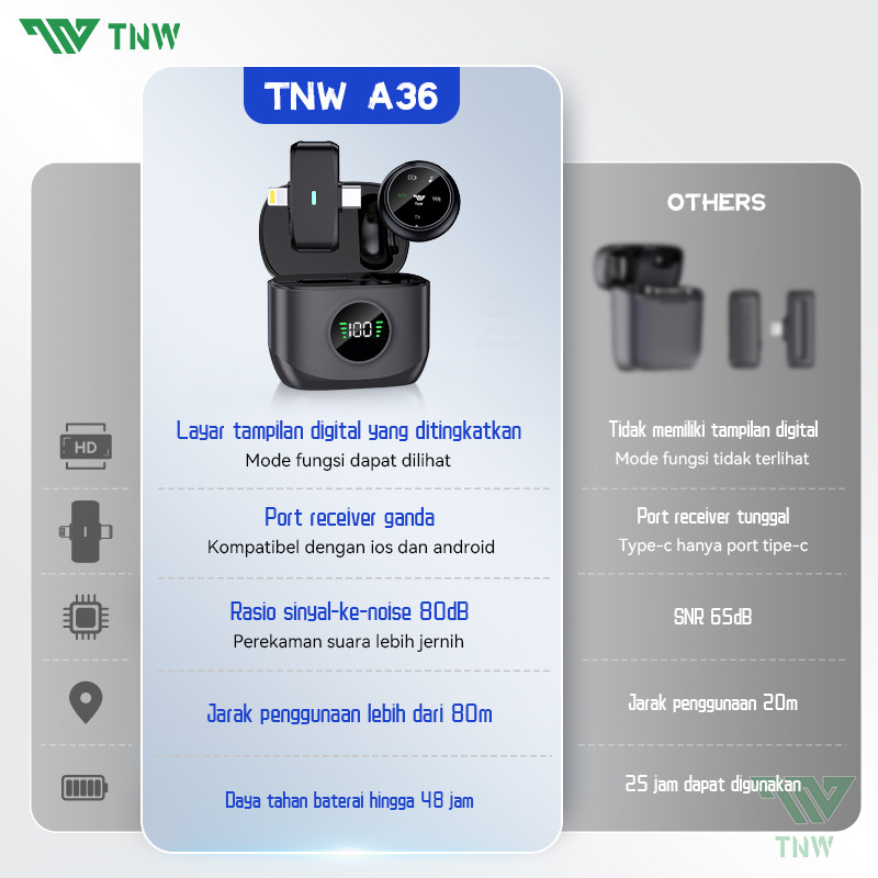 TNW A36 Wireless Microphone 2-In-1 Magnetic Clip On Mic Wireless Lavalier Mikrofon HP Plug & Play Lavalier Mikrofon Dan Charging Case Mic Wireless for Youtuber Vlog Tiktok Live Streaming