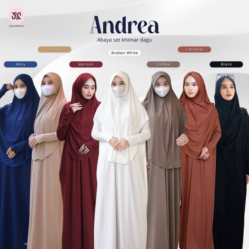 Jannah River Andrea Abaya Set Hijab Dagu Malay Batwing Gamis Lebaran Bahan Jersey Korea Premium Adem Syari Seragam Haji & Umroh