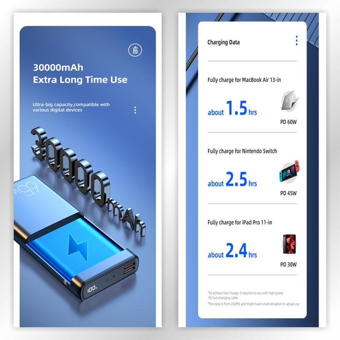 PowerBank USAMS PB59 Powerbank 30000mAh Fast Charging PD 65W Dual QC3.0 + Kabel Data C to C 100W - grey