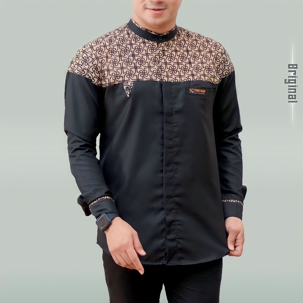 Baju Kemeja Koko Pria Lengan Panjang Kombinasi Batik Klasik Motif Bima Bahan Katun Toyobo