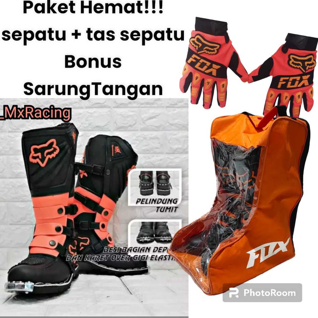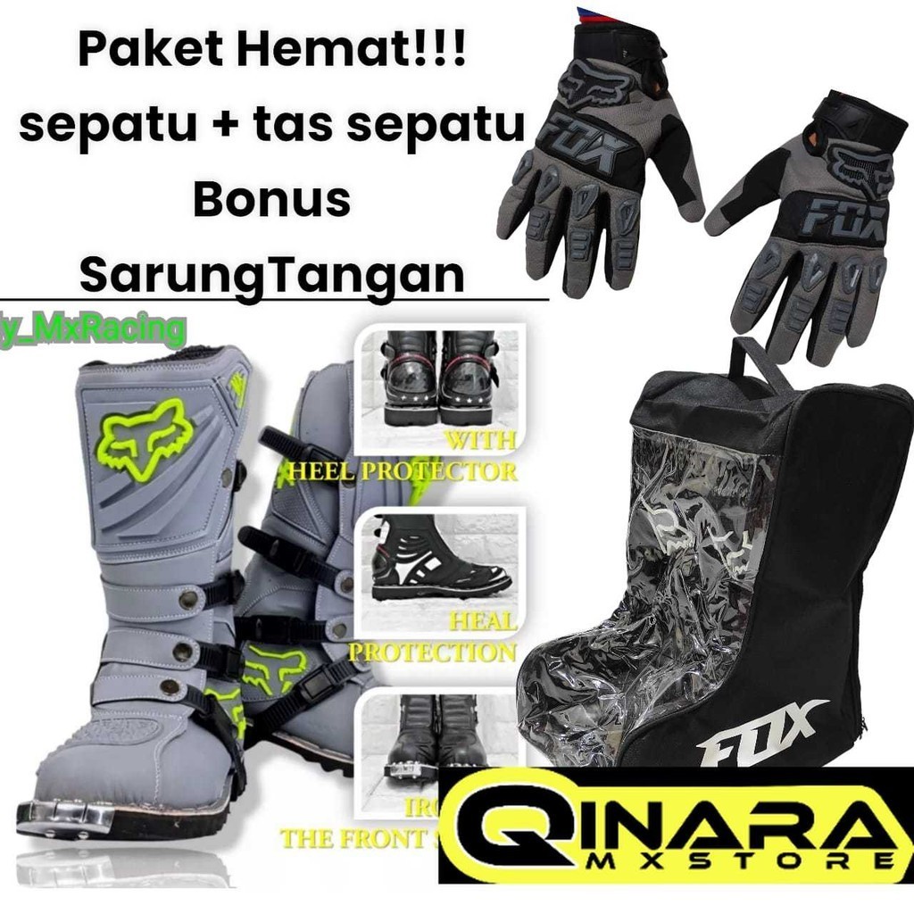 TERMURAH paket hemat sepatu cross trail ujung besi plus tas jingjing buat sepatu bonus sarung tangan boots fx grey fou