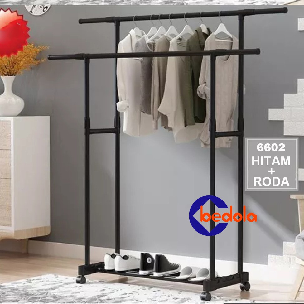 Stand hanger double rak gantungan pakaian serbaguna rak baju dengan 4 roda 2 sisi