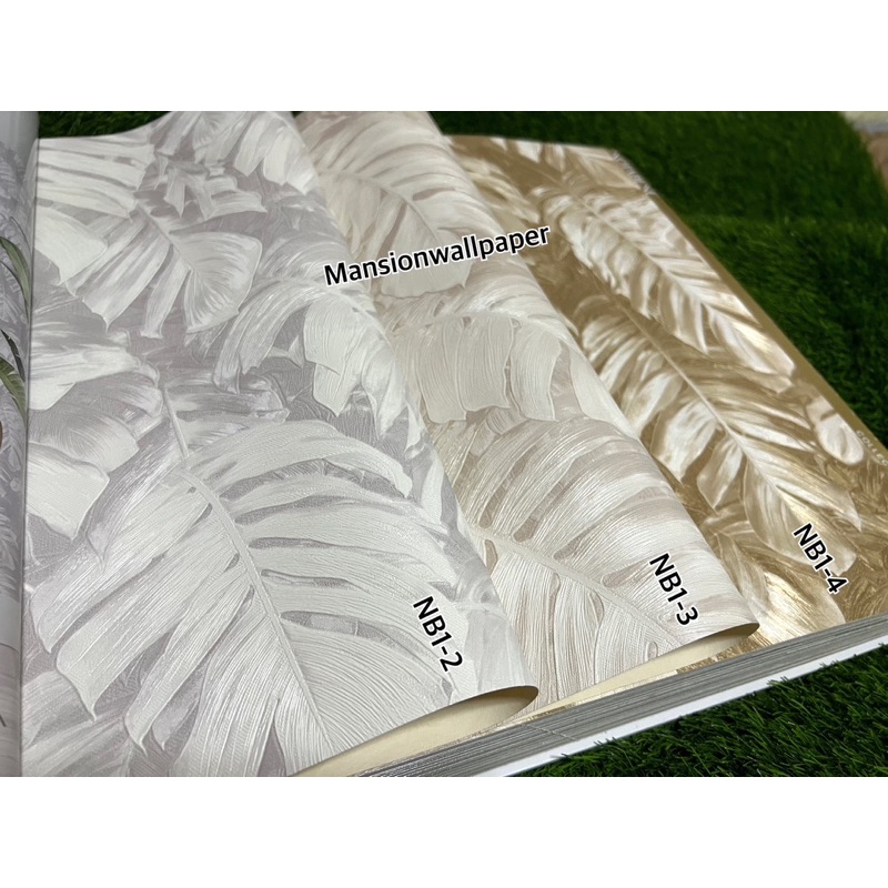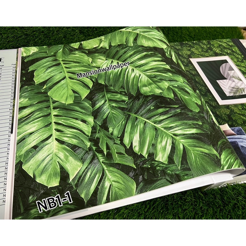 Wallpaper Dinding Daun Tropical Hijau Abu Cream Monstera