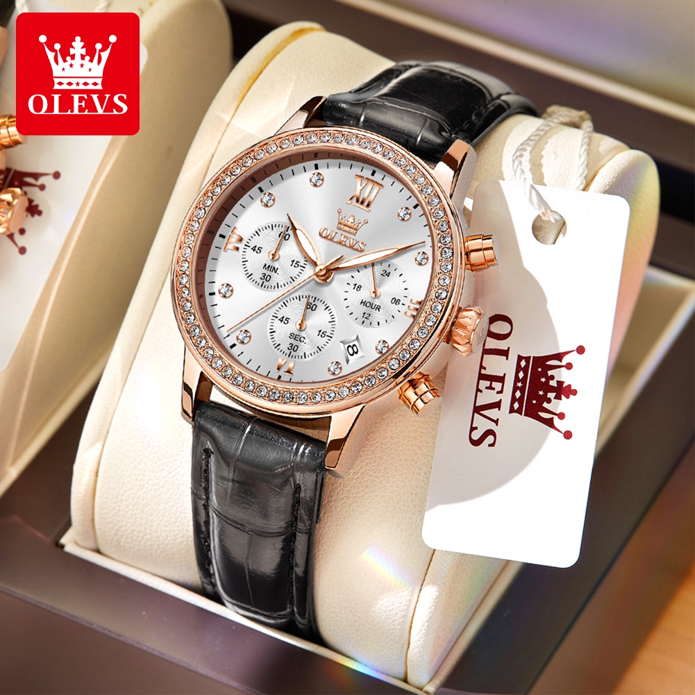 OLEVS Jam Tangan Wanita Anti Air Original Kecil Tahan Tali Kulit Kuarsa Chrono Women Watch Analog Stock el 9933
