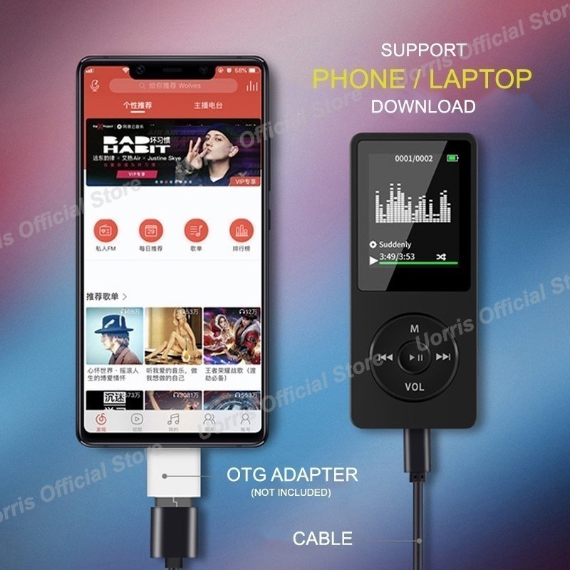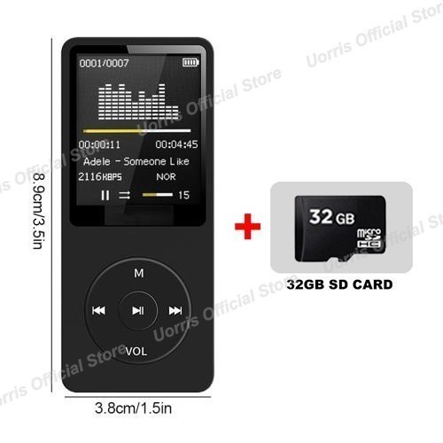UORRIS MP4 Mini Player Bluetooth MP3 Player Bluetooth Free 32GB Card Pemutar Musik rtabel layar USB/Type C 1.8 In