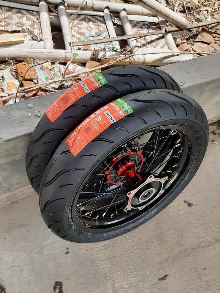 Wheelset Supermoto CRF 150 L Ban Maxxis Baru Murah Velg Rossi Ukur 250/300 Harga Promo - merah, dengan piringan