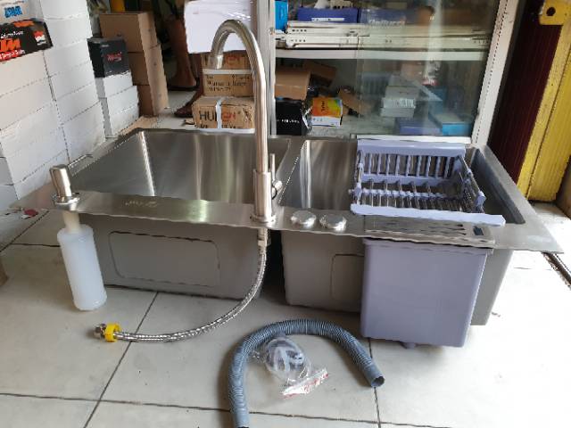 KITCHEN SINK 8245 / Wastafel Bak Cuci Piring 2 Lubang Tebal Stainless SUS304 tebal 3mm 82cm PAKET KOMPLIT PROMO