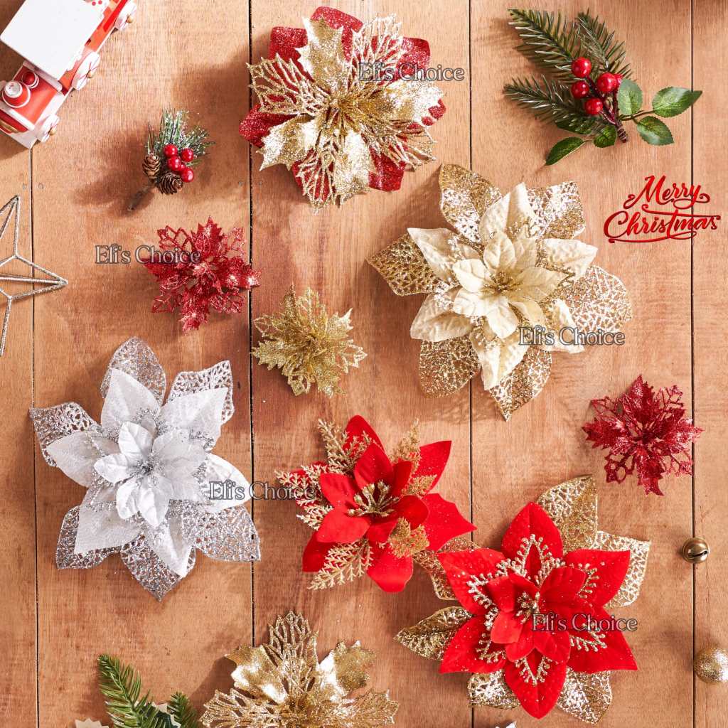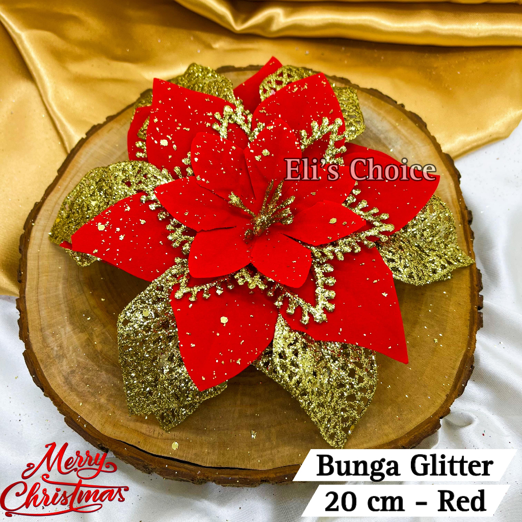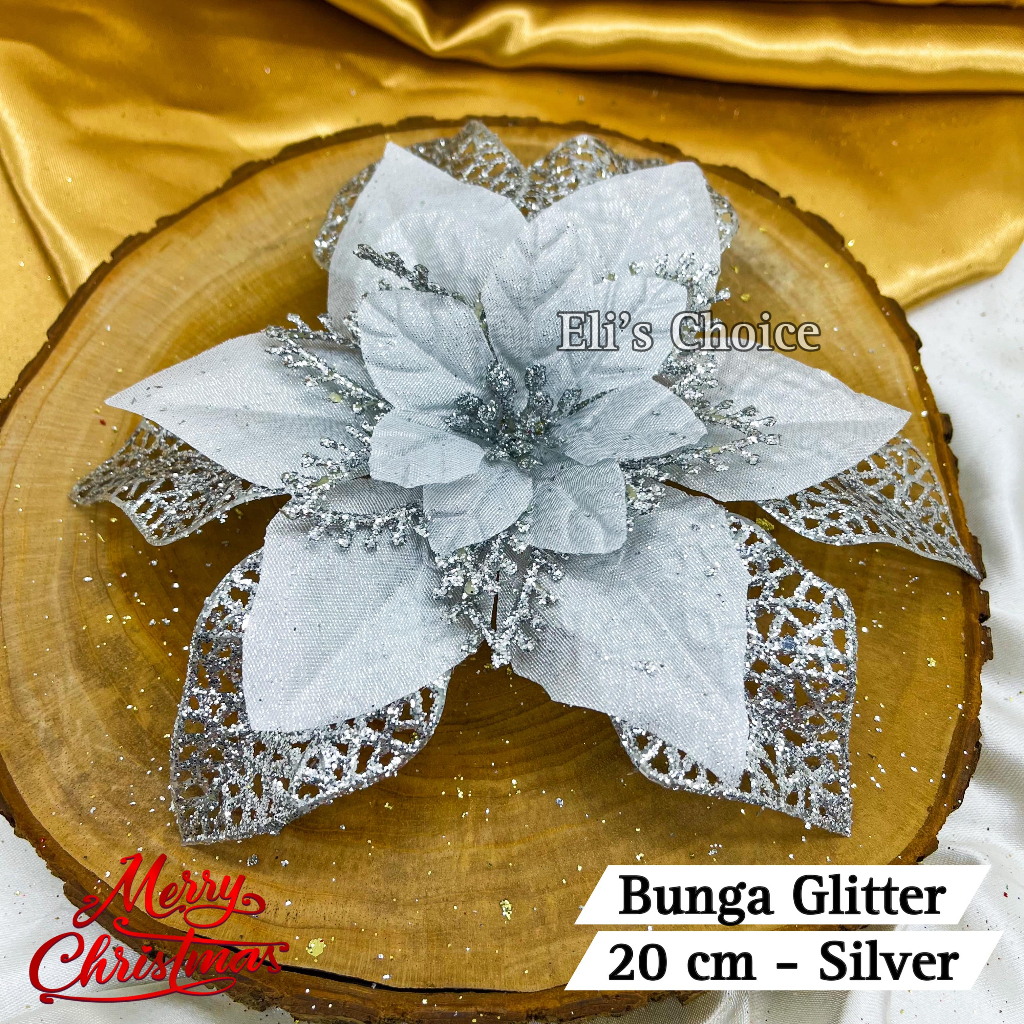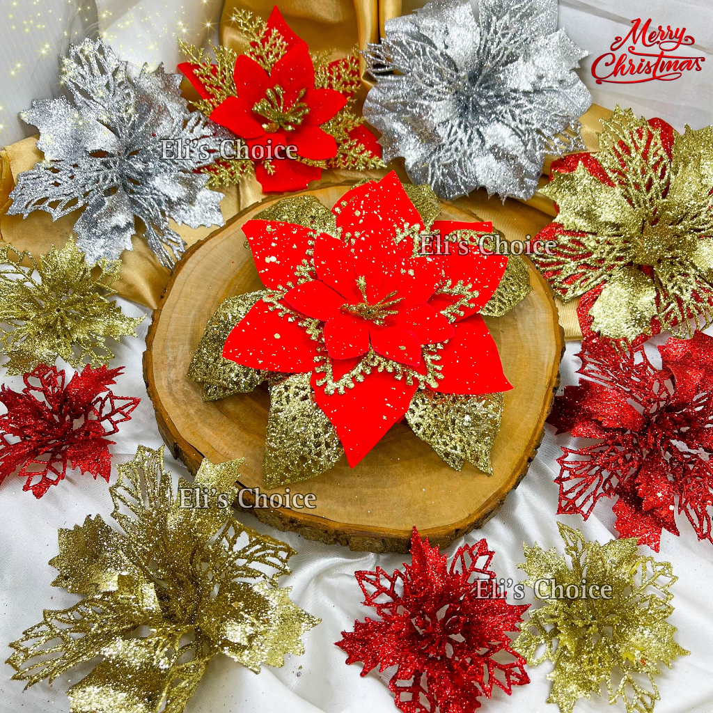 Grosir Hiasan Bunga Natal Bunga Katsuba insettia Merah Silver Bunga Hias Glitter