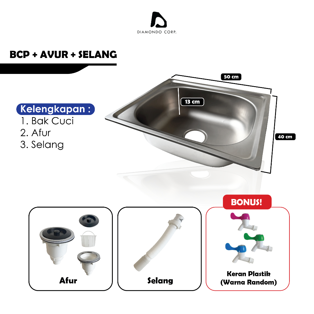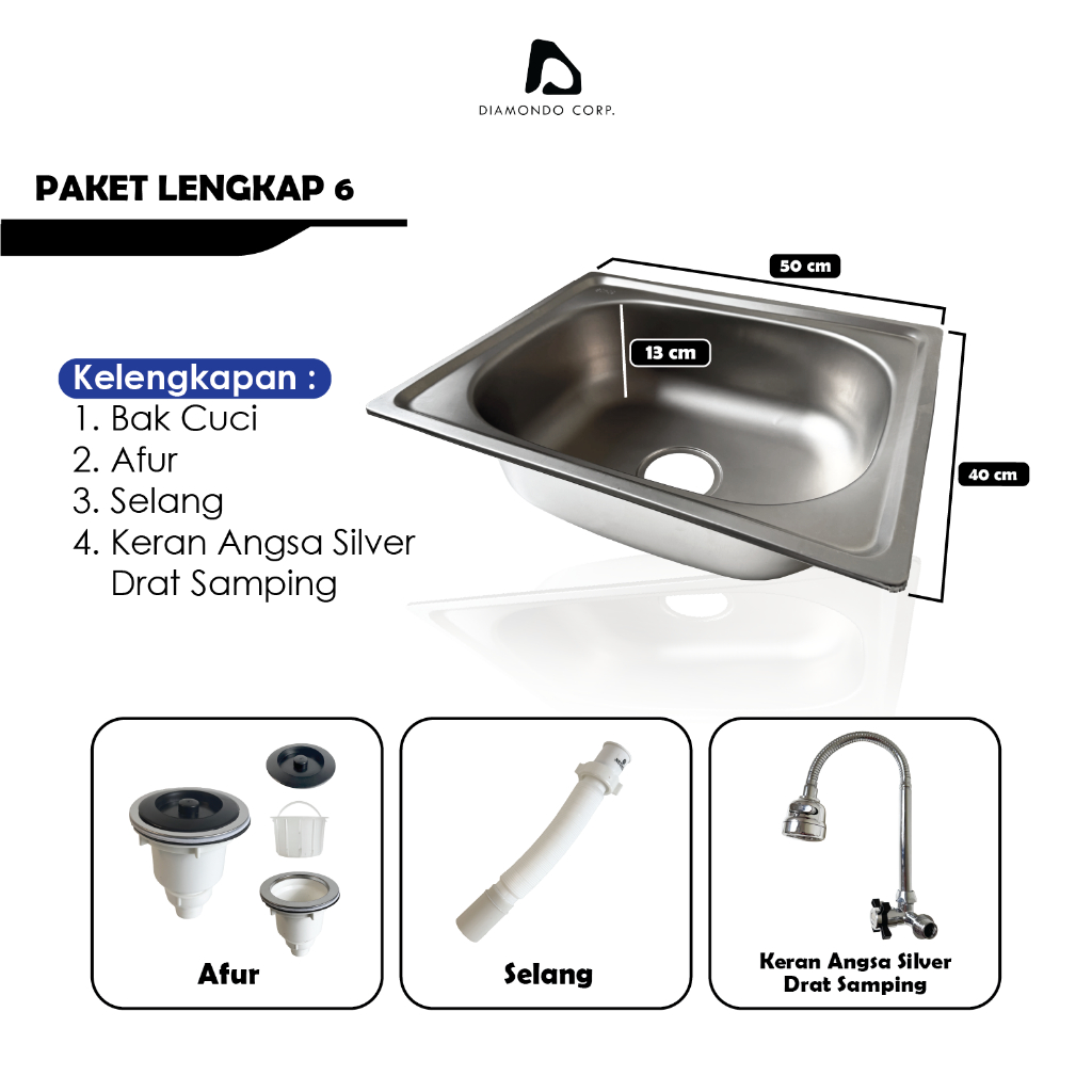 Bak Cuci Piring Wastafel Sink Stainless Steel Dapur Tebal Satu Lubang Kitchen Sink Set Ukuran 50 Cm x 40 Cm Lengkap/ Ter