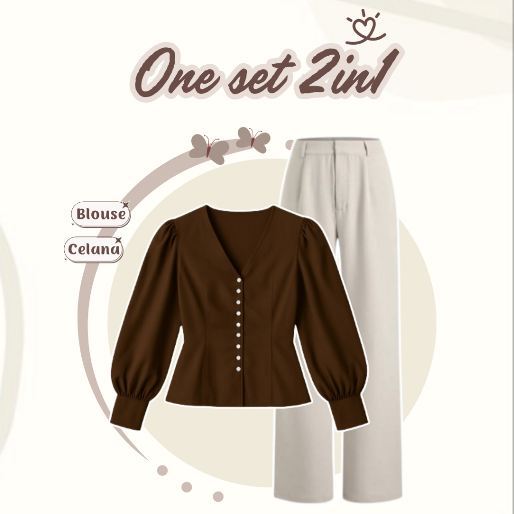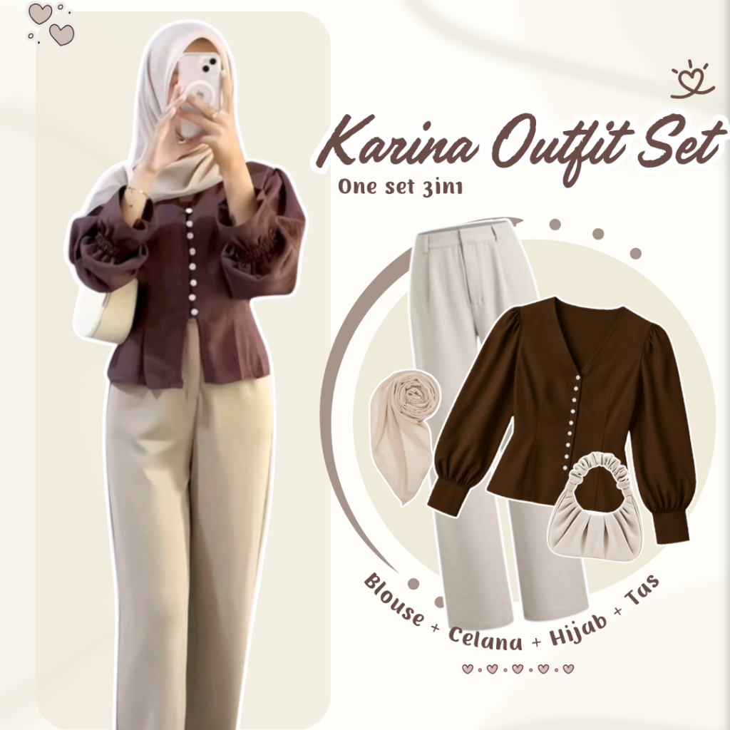 Dreamora _ one set 3in1 Korean Style Blouse Lengan Balon + Celana + Tas Bahu + Hijab DM053ND