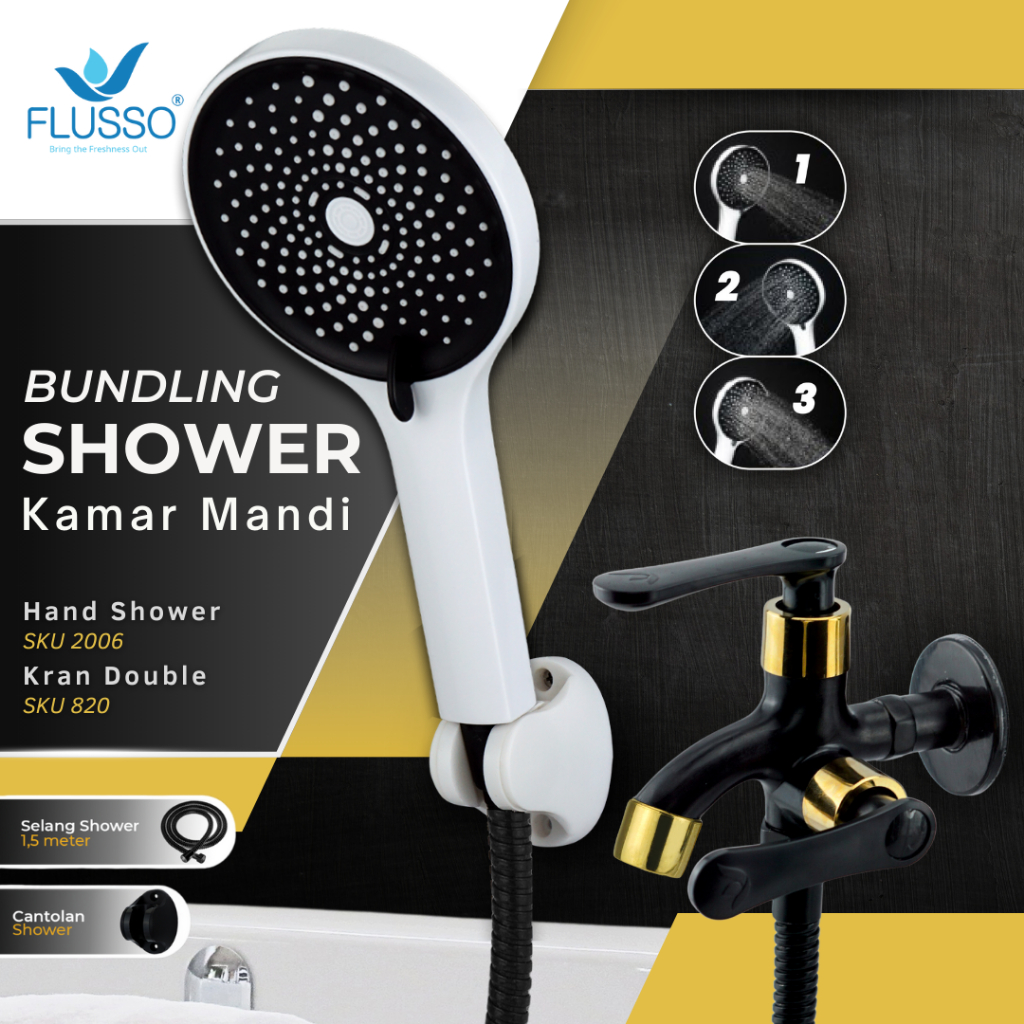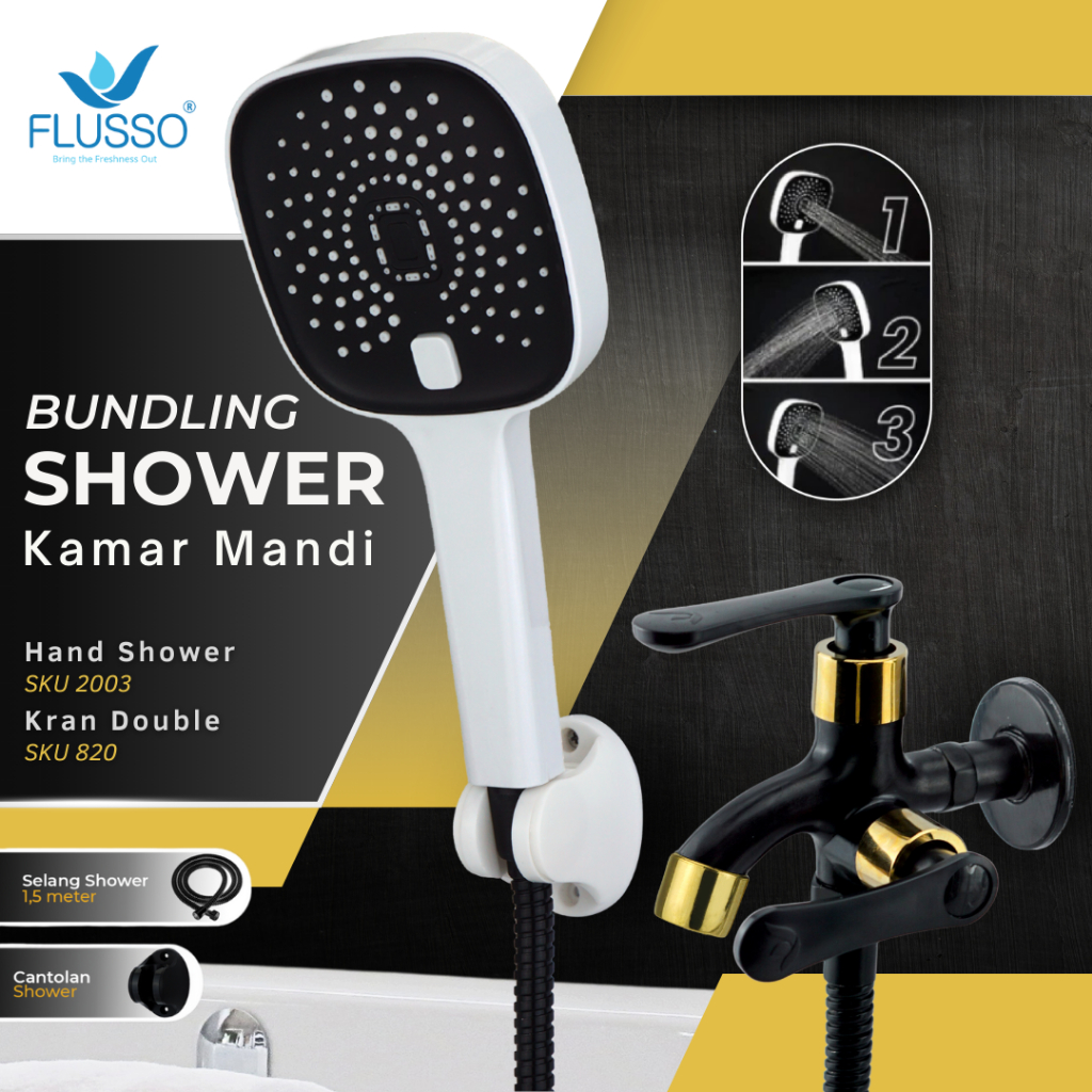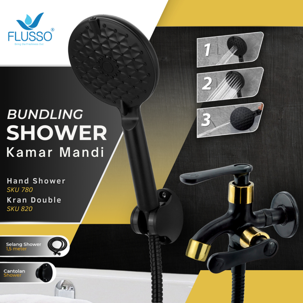 FLUSSO Paket Hemat Shower Set Komplit + Kran Double Shower Black Kuningan Original | 820