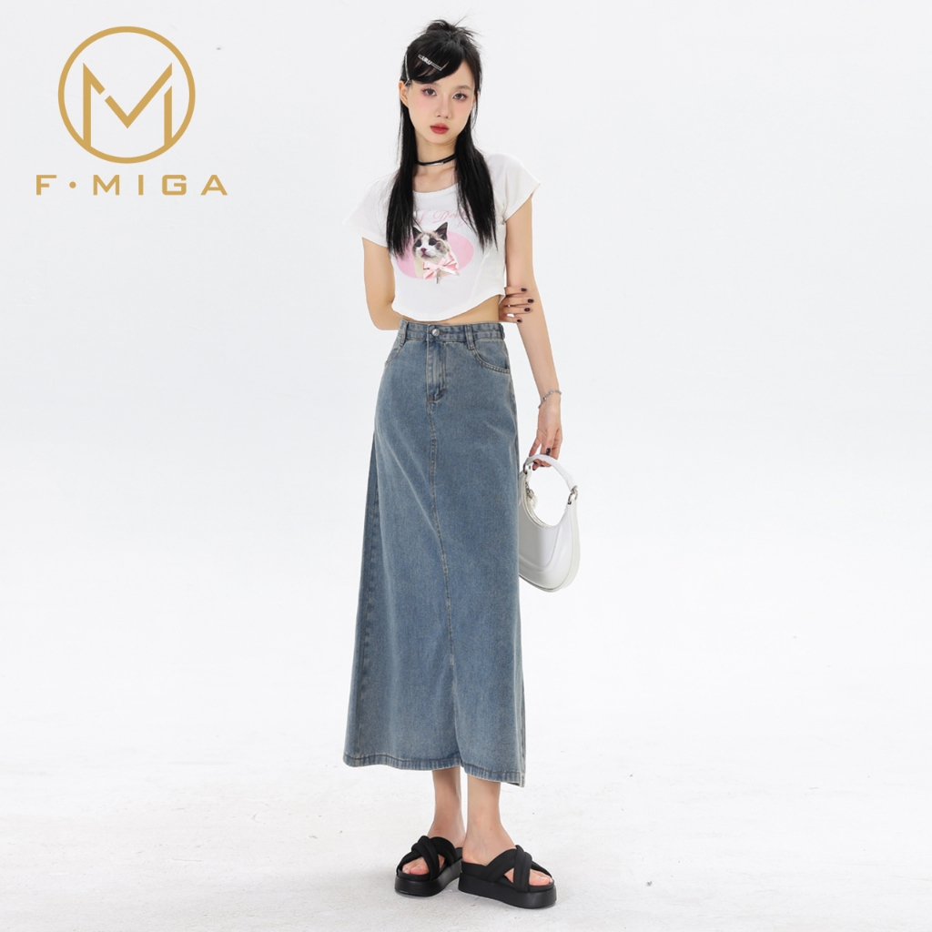 F·MIGA C46 High Waist Denim Rok Jeans Midi Wanita