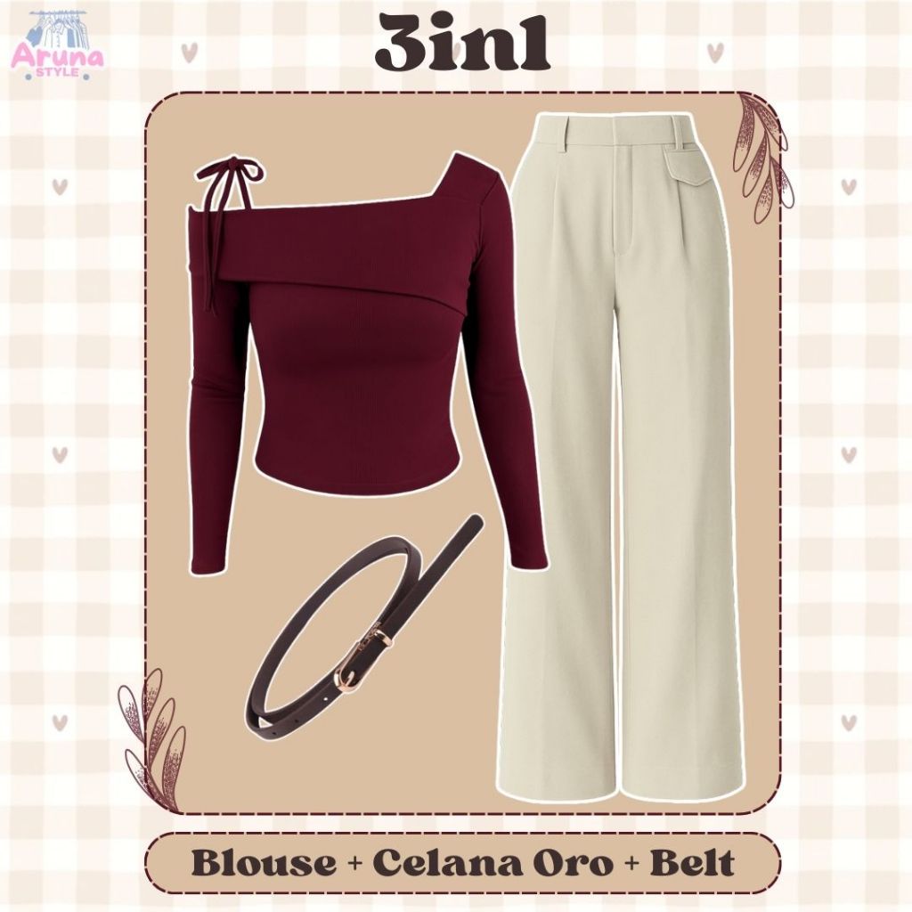 Setelan Ala Cewek Korea Casual Sabrina Tali, Celana Oro, Belt One Set Remaja Wanita Kekinian AS5J