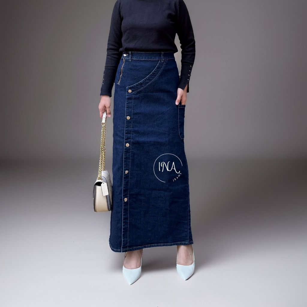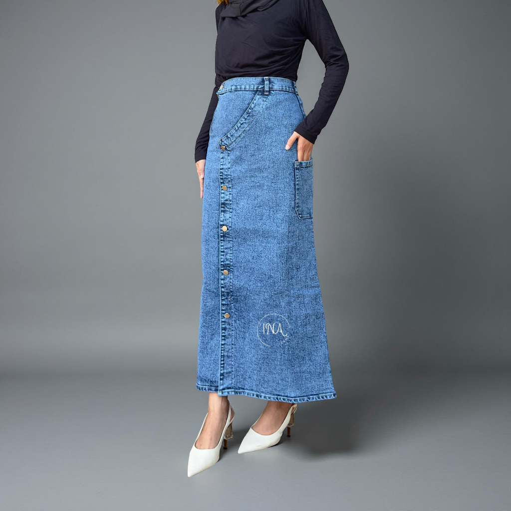Leta Button Skirt - Rok Jeans Panjang Wanita Stretch Pinggang Karet Semi A Line