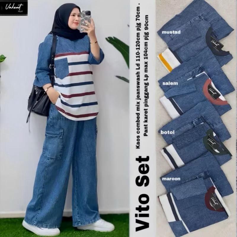 Setelan Jeans XL,XXL Wanita Dewasa Atasan Combed 24s Celana Jeans Kulot Cargo, Setelan Wanita Kekinian