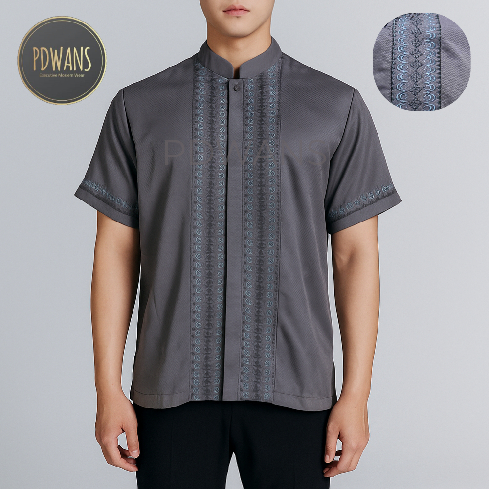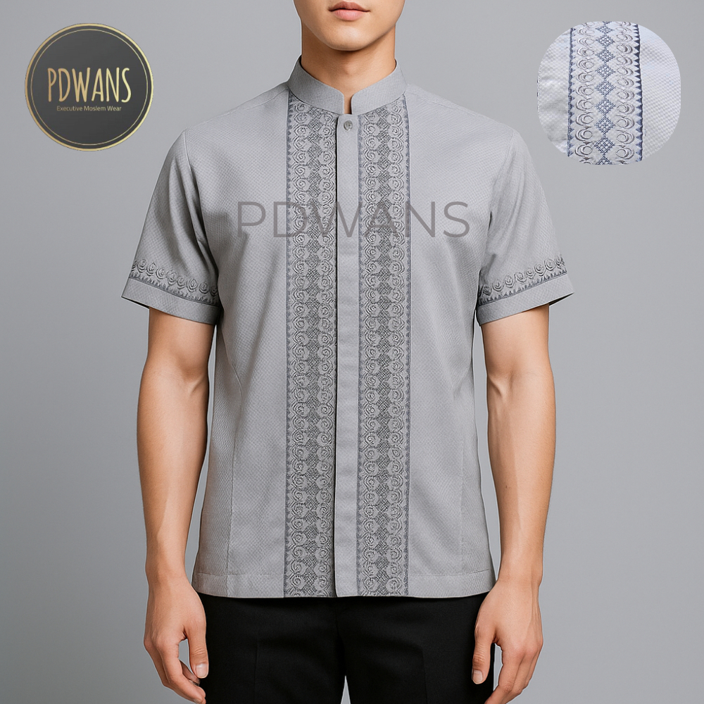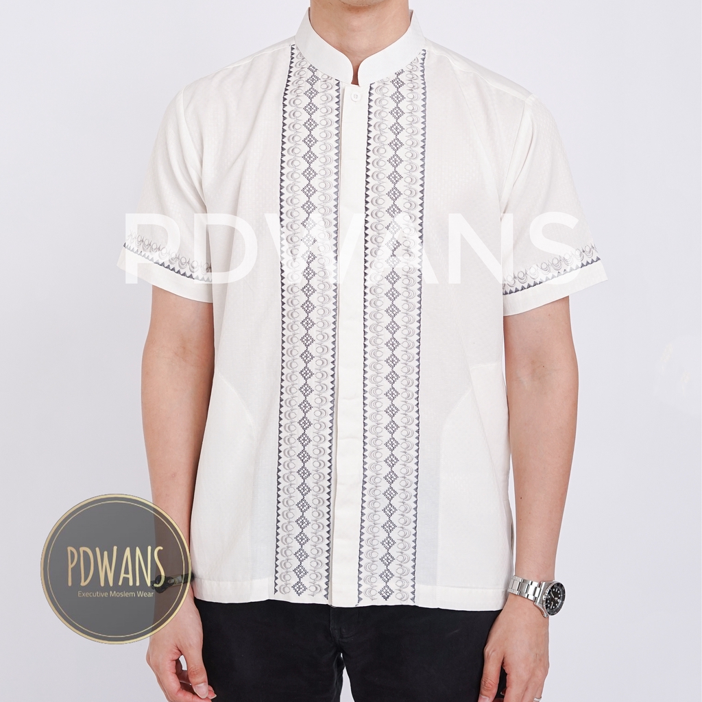 BAJU KOKO Lengan Pendek Putih Tulang ALS07 Kemeja Koko Muslim Bordir Pria