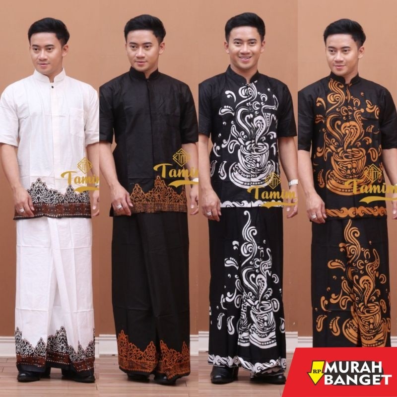 Baju lebaran cowok- Setelan Sarung & Kemeja Koko Pria Lengan Pendek Motif Cangkir Kopi Tumpal Terbaru