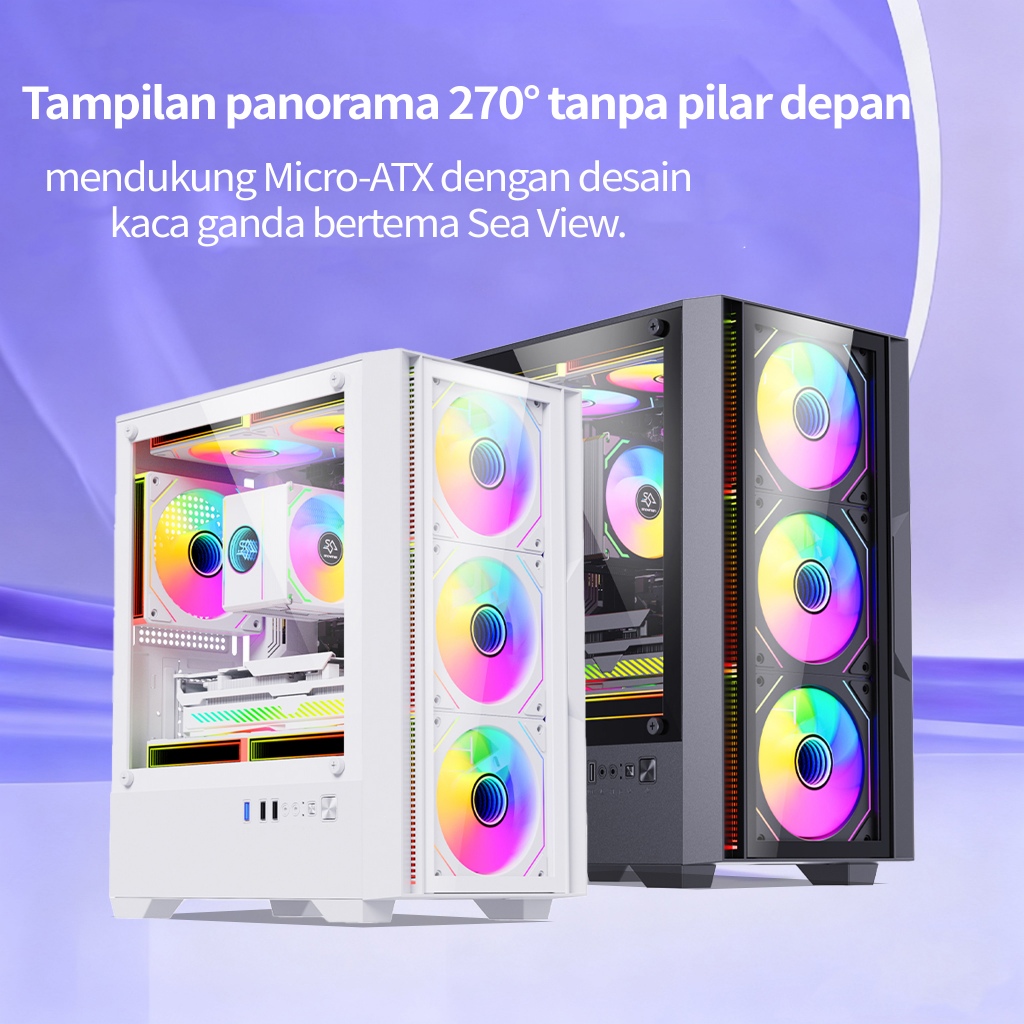 JUTU Casing Komputer Desktop R Pemandangan Laut Casing Utama Transparan Sisi Kaca Permainan Komputer Desktop Tampak Tinggi Berwarna Hitam Putih 4080S/5090D