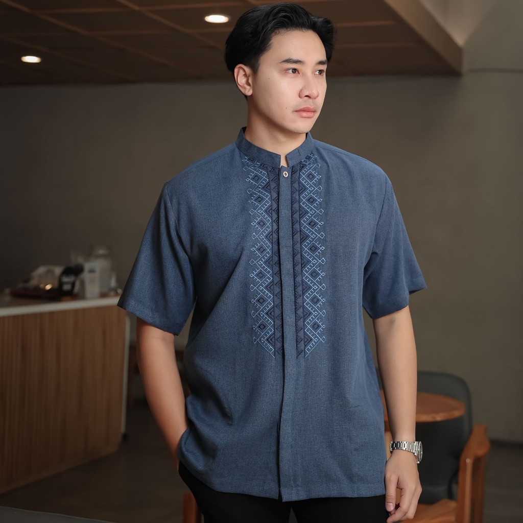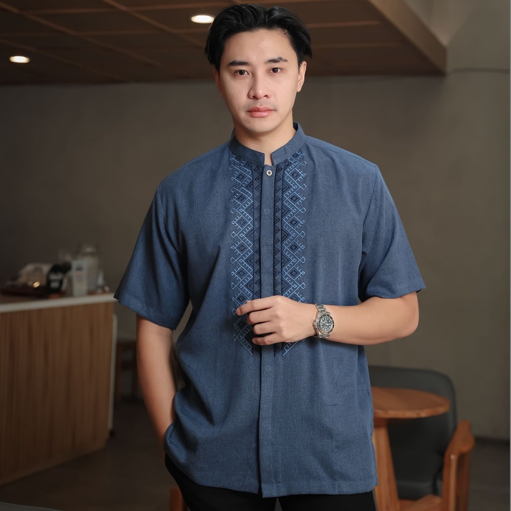 Koko.uzma Baju Koko Lengan Pendek Bordir Biru Krem Abu Pria Dewasa