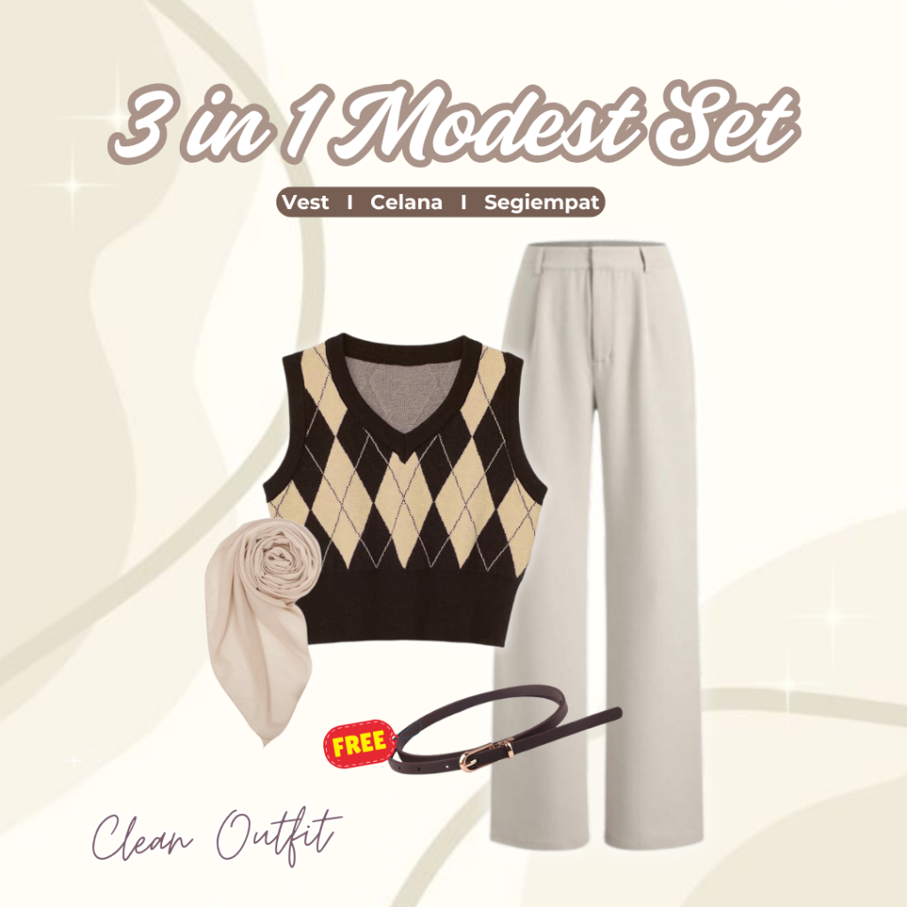 One Set Korean Style 4in1 / Vest + Kemeja + Celana + Bella Square / fit Hijab / One Set Hijab Ootd Kekinian / L14N