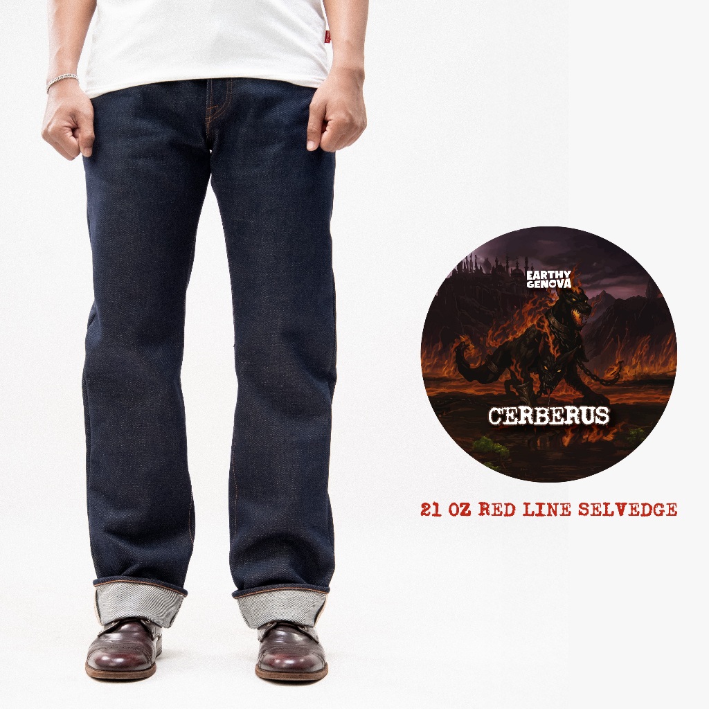 EARTHY GENOVA - Denim Selvedge CERBERUS RED Line Selvedge 21 Oz Sanforized Celana Raw Jeans Pria Deep Indigo