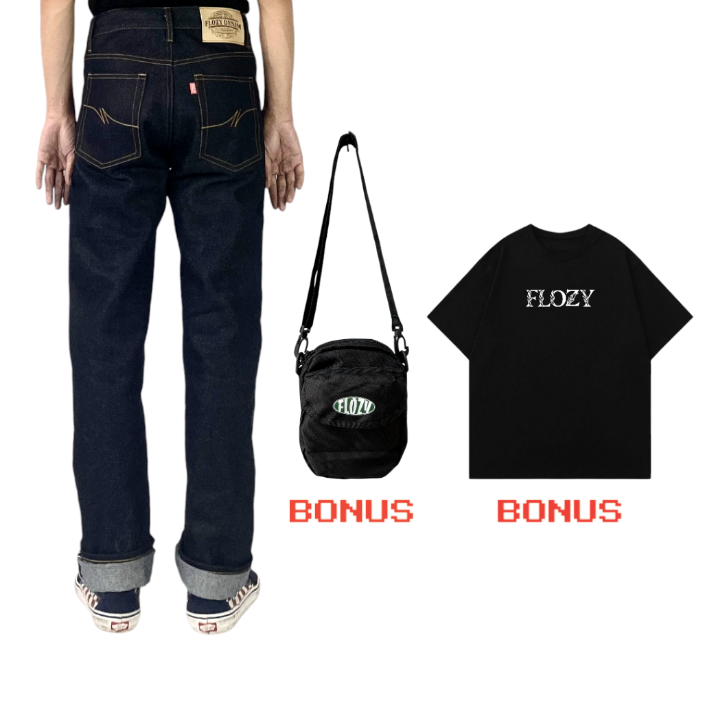 Flozy Celana Jeans Raw Denim Selvedge Accent 15oz (Bonus Kaos + Tas) Slim Straight