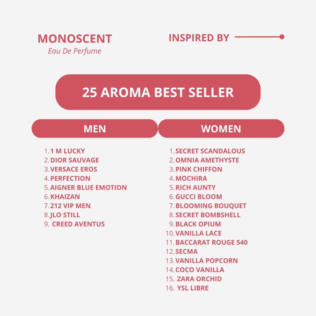 Scandalous (Women), Omnia Amethy (Women), Pink Chiffon (Women), Mochira (Women), Rich Aunty (Women), Gucci Bloom (Women), Bomshell (Women), Bouquet (Women), Coco Vanilla (Women), Black Opium (Unisex), Secma (Unisex), JLO STILL (Unisex), Red Bacarat (Unisex), Popcorn (Unisex), Dior Sauvage (Men), 1 M Lucky (Men), Khaizan (Men), Versace Eros (Men), Aigner Blue (Men), Perfection (Men), Creed Aventus (Men), Vanilla Lace (Women), Zara Orchid (Women), YSL Libre (Women), 212 VIP (Men)