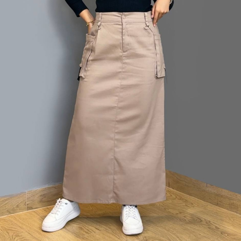Rok Cargo Kantong Serut / Skirt Korean Style Katun Premium / Rok Span Belah Jumbo