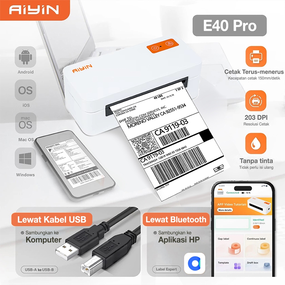 Printer Resi Termal Bluetooth & USB Cetak Barcode/Stiker Tanpa Tinta Kompatibel Semua Ekspedisi