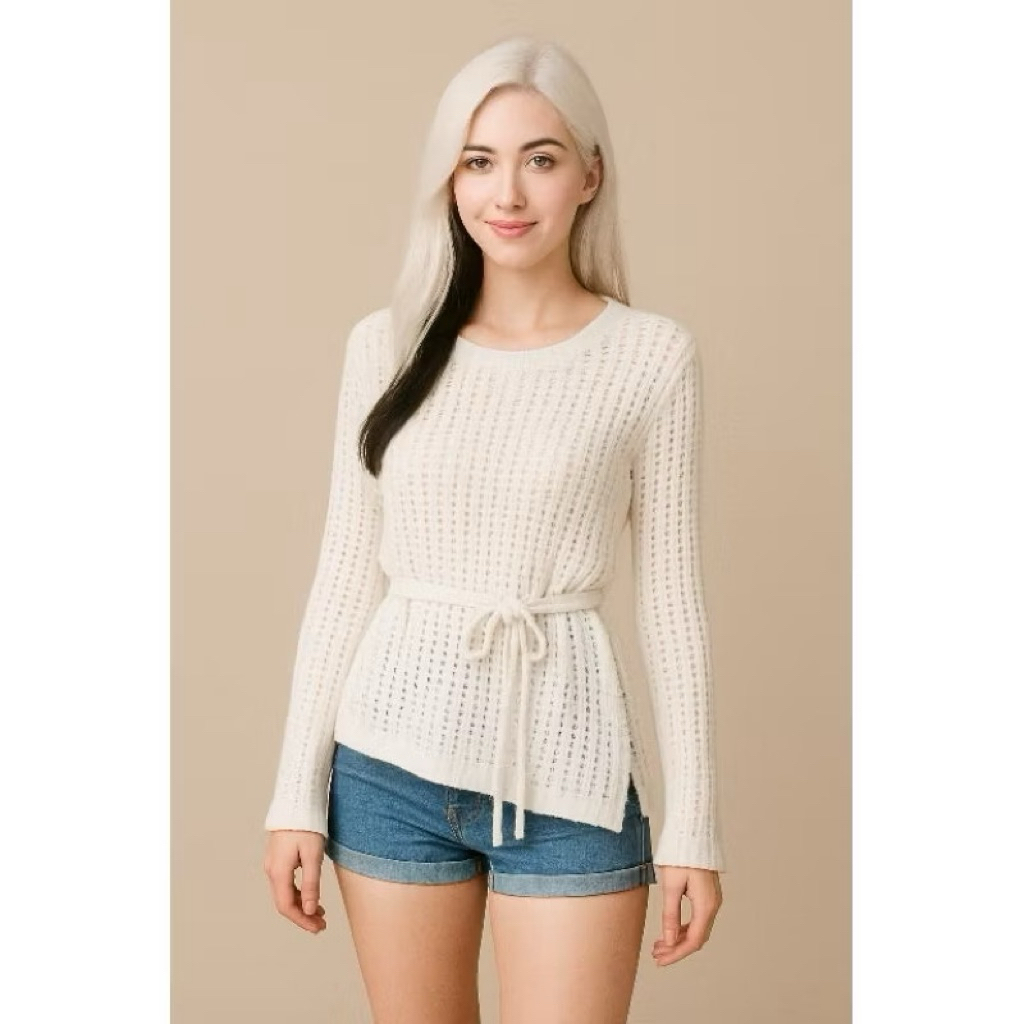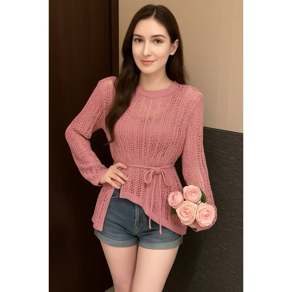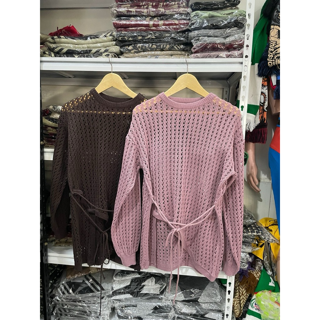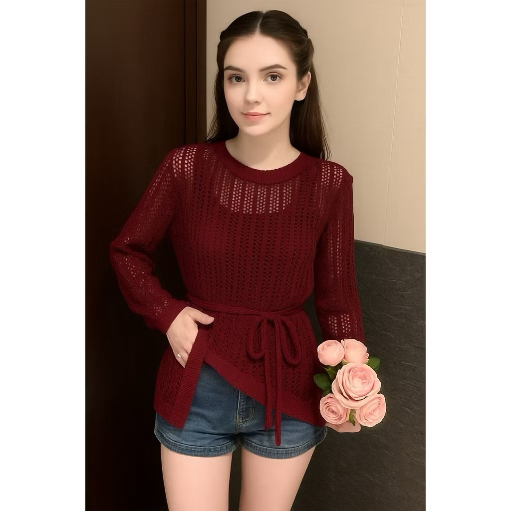Baju Tunik Selempang Wanita Bahan Rajut Lengan Panjang Jaring Bolong Bolong Korean Style Tebal By Yuruma