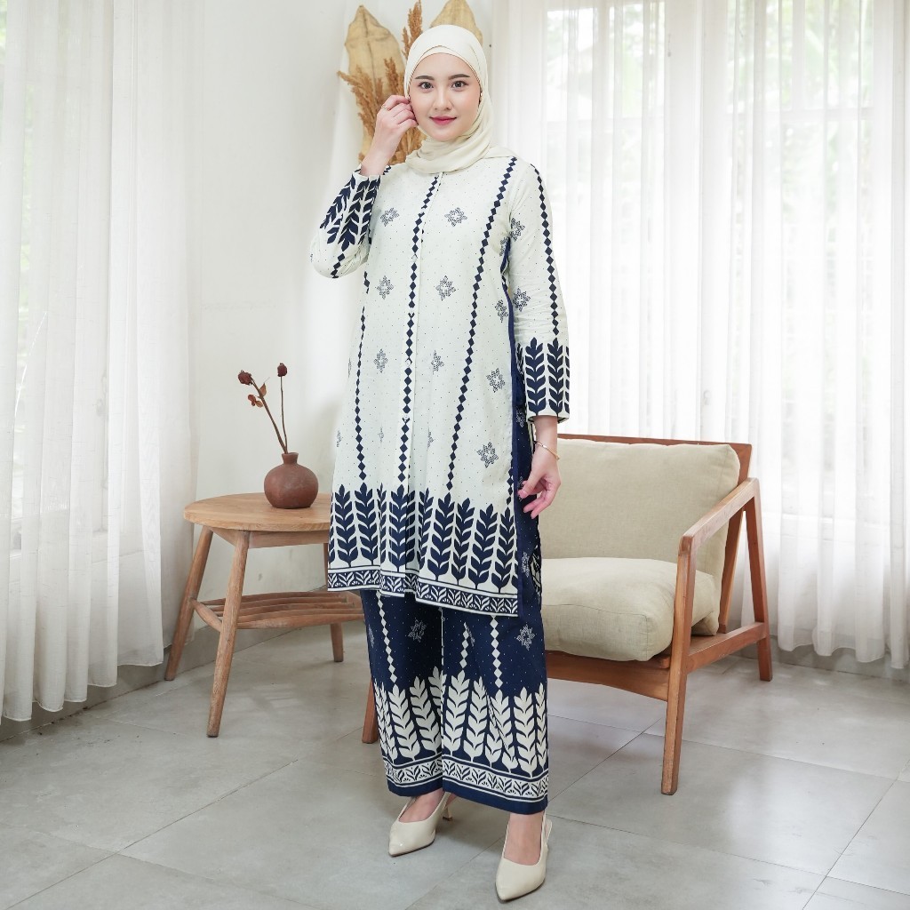 Lalita Atasan Wanita Tunik Batik Modern Casual Family Set Sarimbit Keluarga Baju Lebaran Putih Navy
