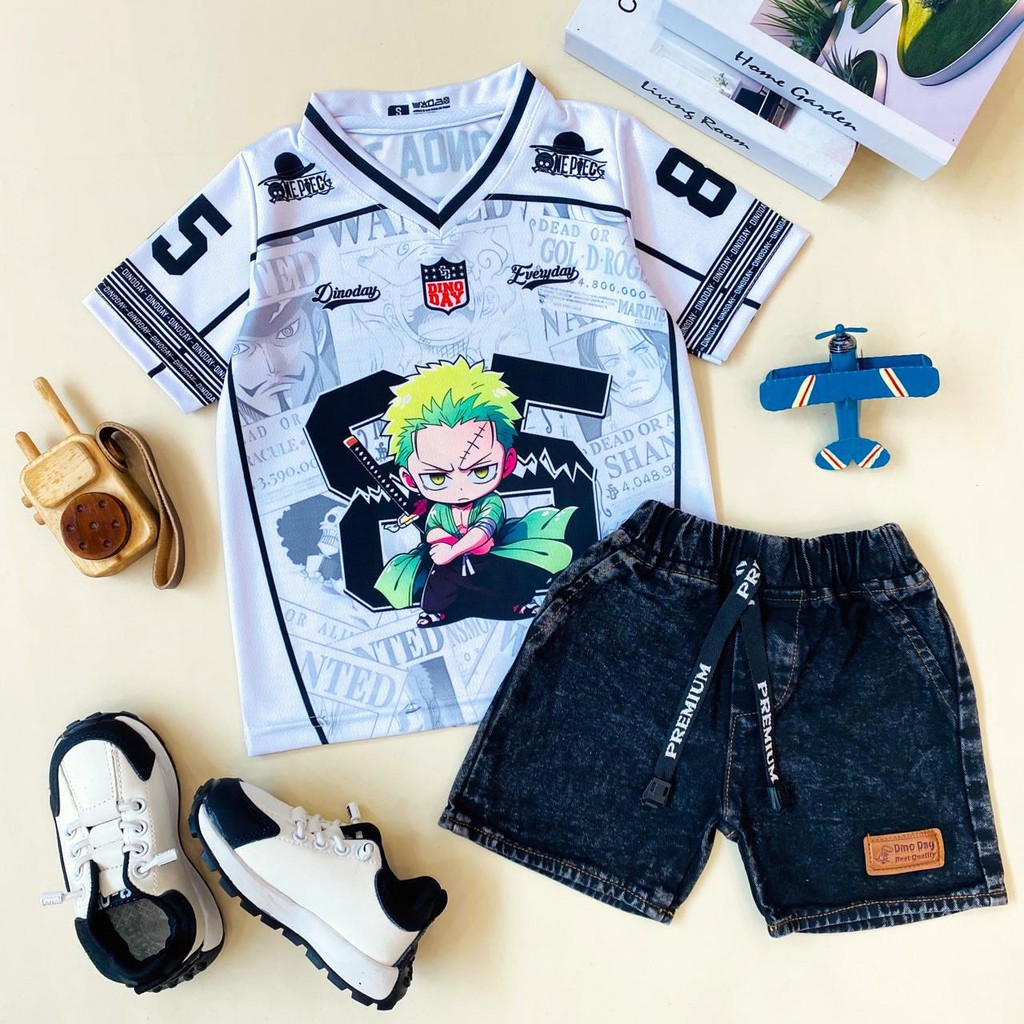 ESTISHOP X DINODAY Setelan Baju Anak Laki Kaos Jersey one Piece Luffy Celana Cargo Premnium Tahun