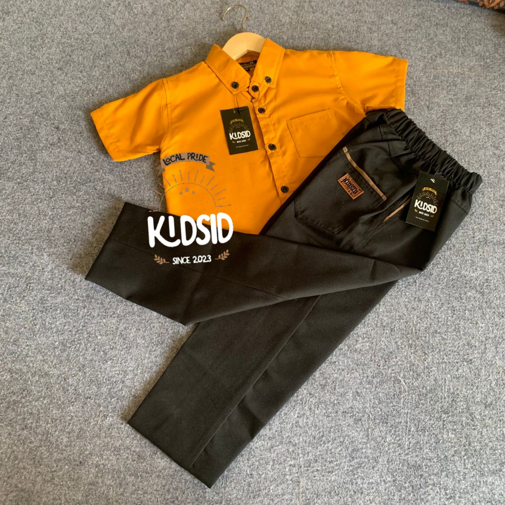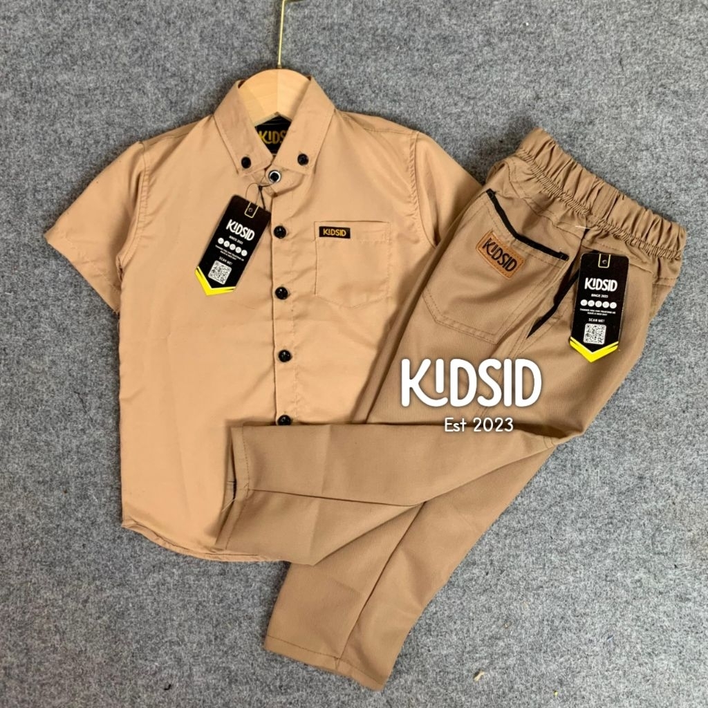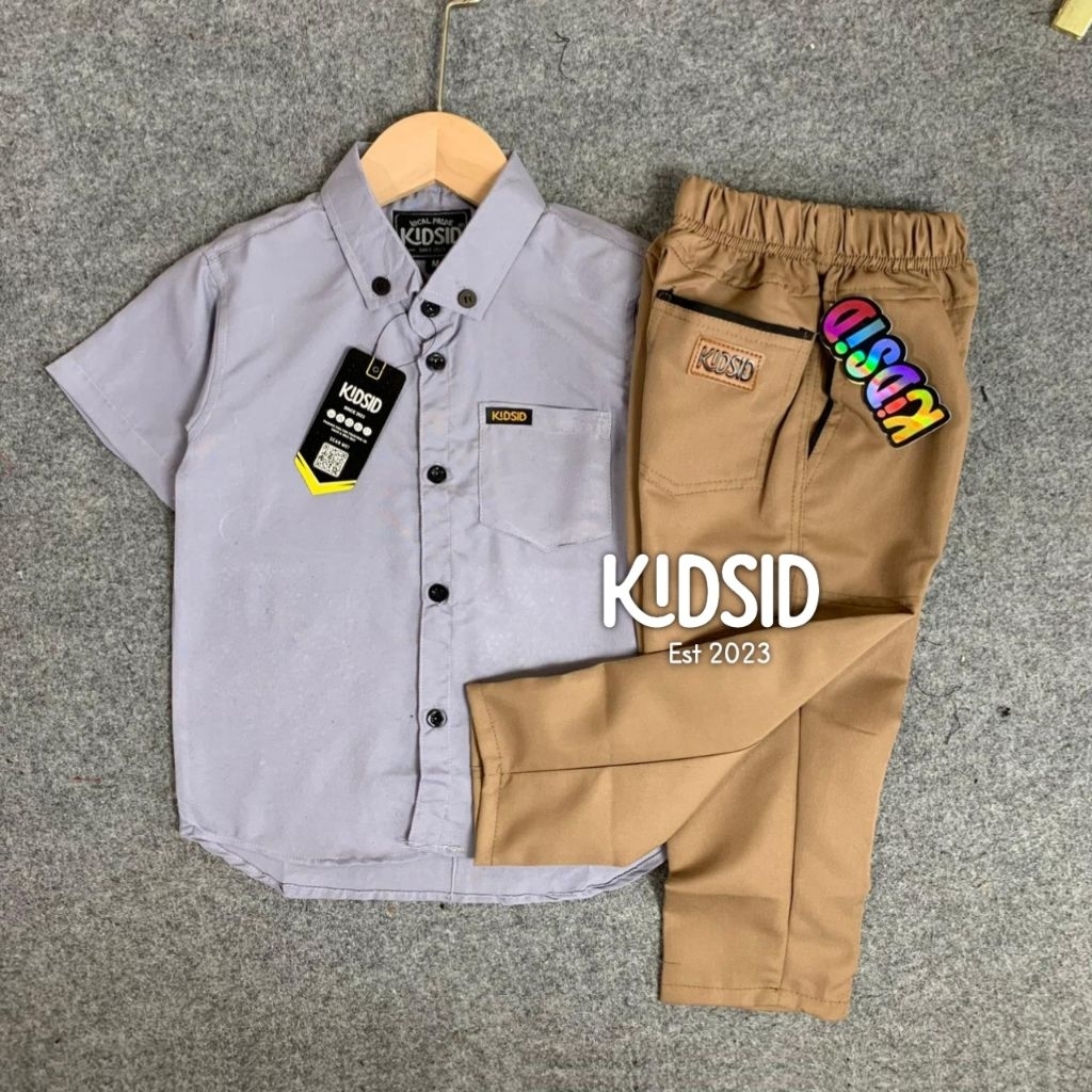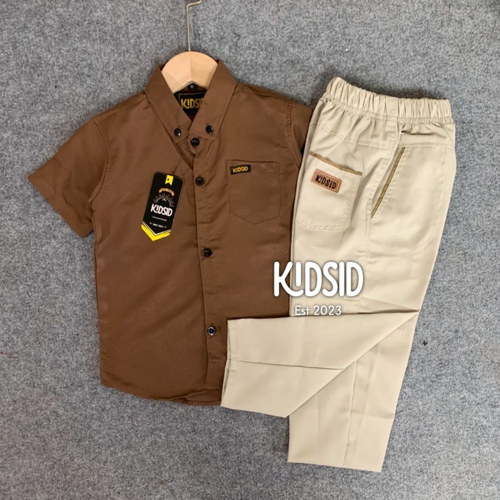 KIDSID Setelan kemeja anak lengan pendek warna Dark Brown + celana chinos usia 1-14 Tahun - One set Baju setelan anak Ba