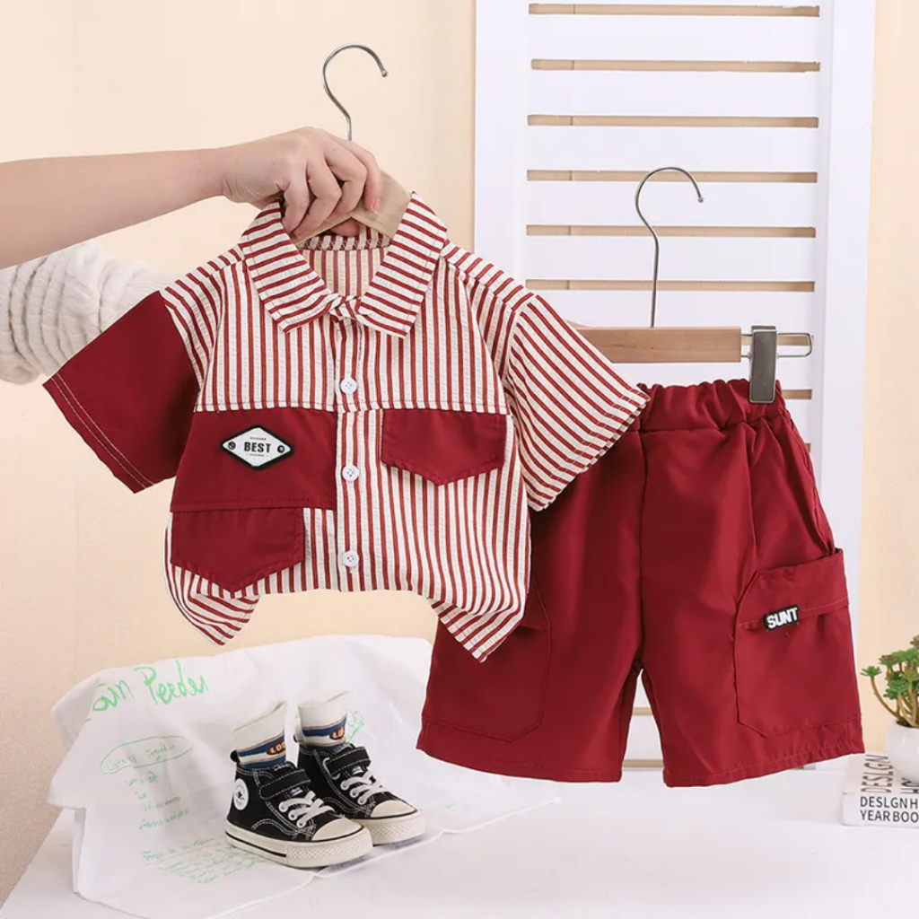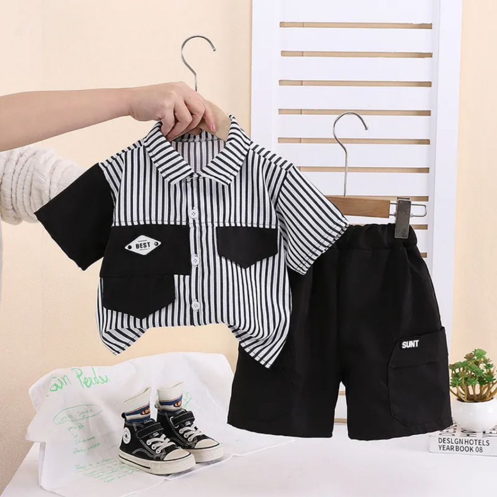 setelan kemeja kombinasi anak laki laki celana pendek cargo 1-6 tahun