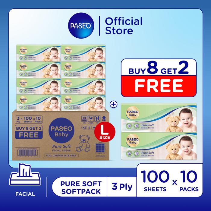 BUY 8 GET 2 FREE PASEO BABY PURE SOFT PREMIUM FACIAL TISSUE 3PLY 100'S | TISU BAYI 3 HELAI TISSU WAJAH - KARTON