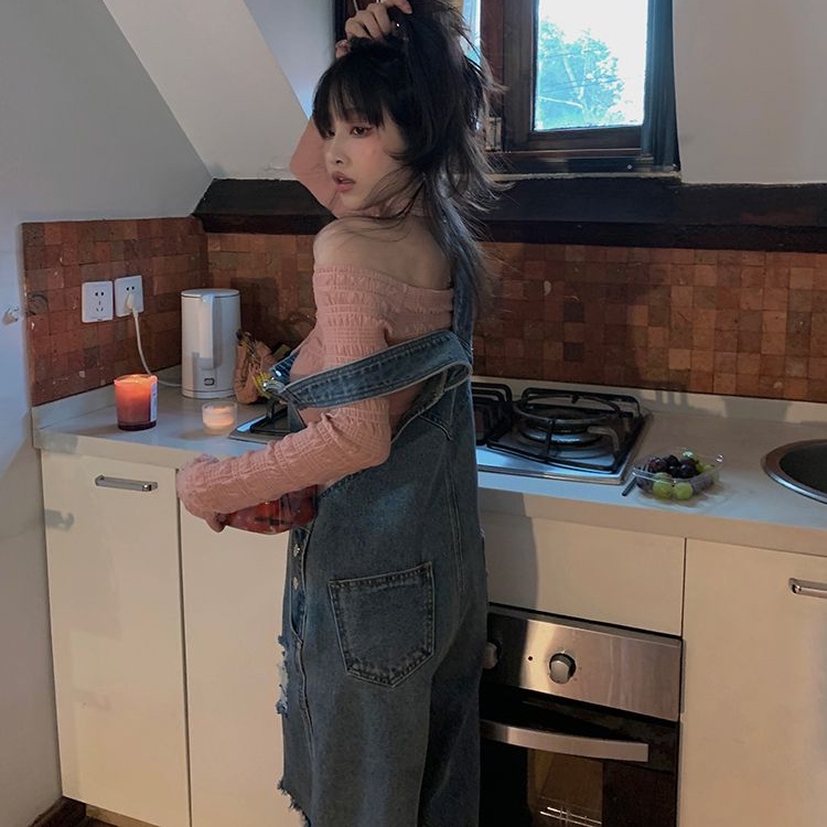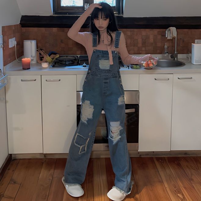 Retro Overall Denim Robek Wanita Pinggang Tinggi Retro Mengepel Celana Lebar Kaki