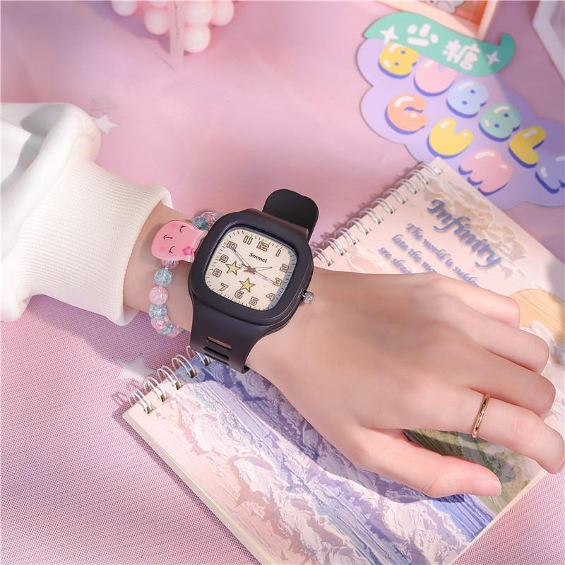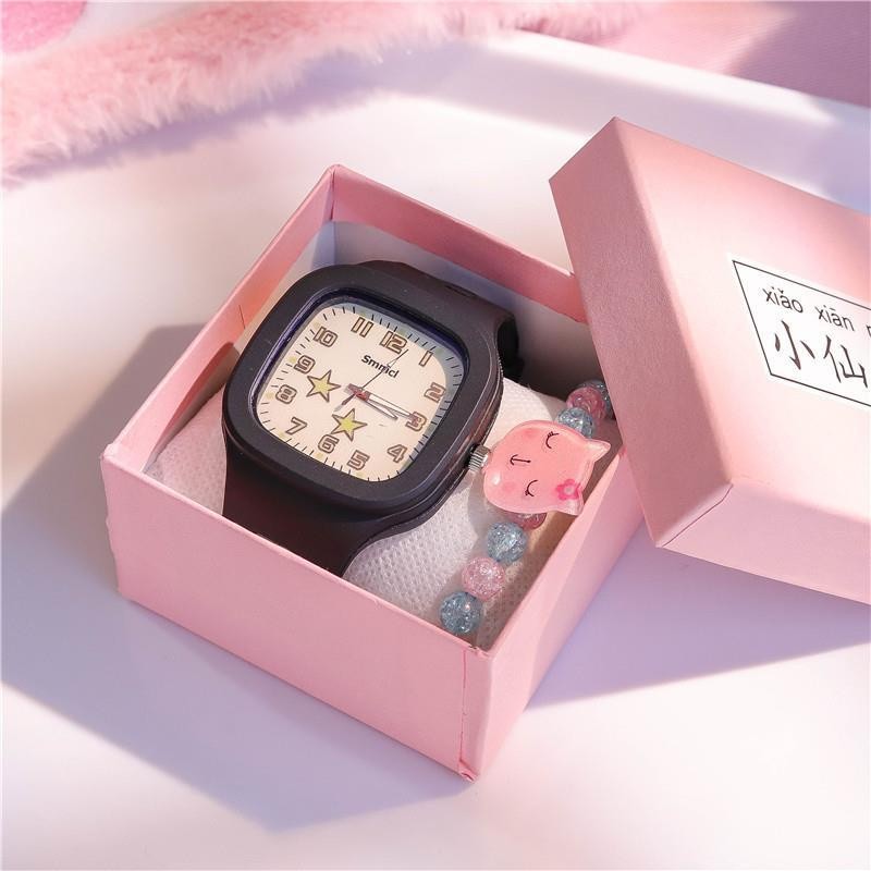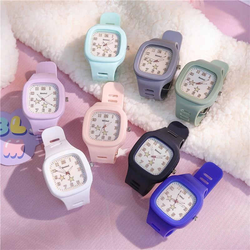 Jam Tangan 3 Pcs Set Kuarsa Dial Persegi Tali Silikon Night Glow Layar Gelang Kartun Bintang