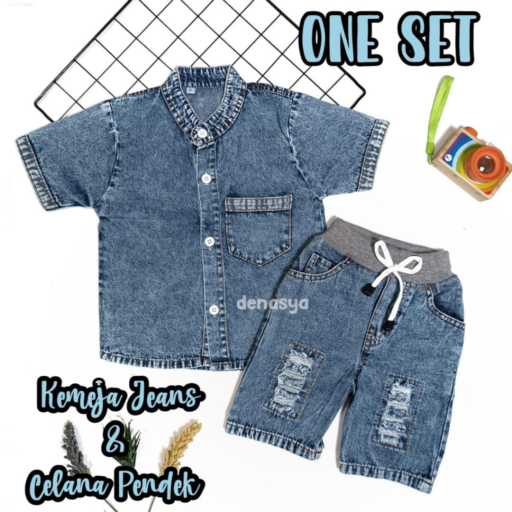 SETELAN JEANS ANAK LAKI-LAKI/ KEMEJA JEANS ANAK SAND WASH/ CELANA SOBEK PENDEK ANAK Usia 1-8 Tahun