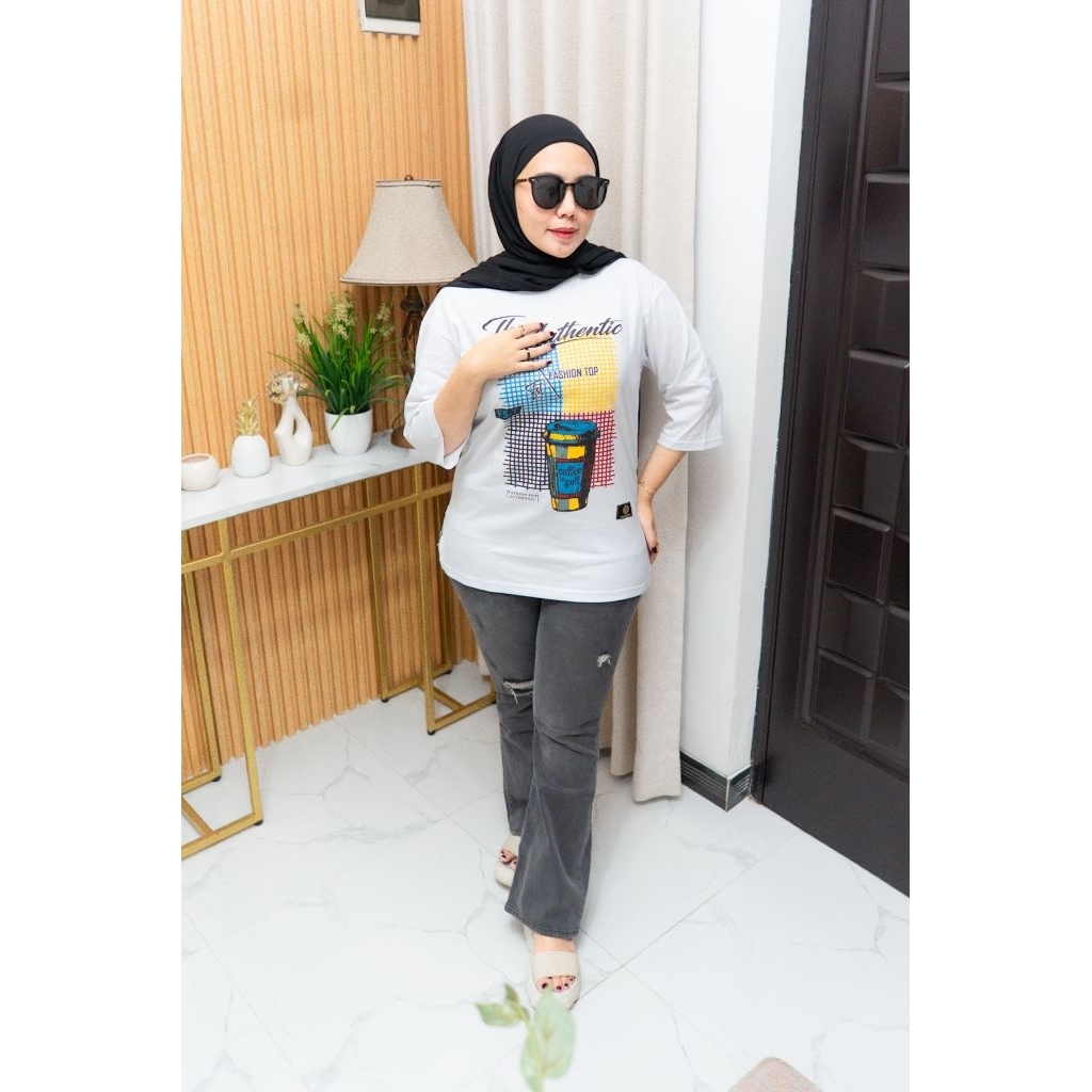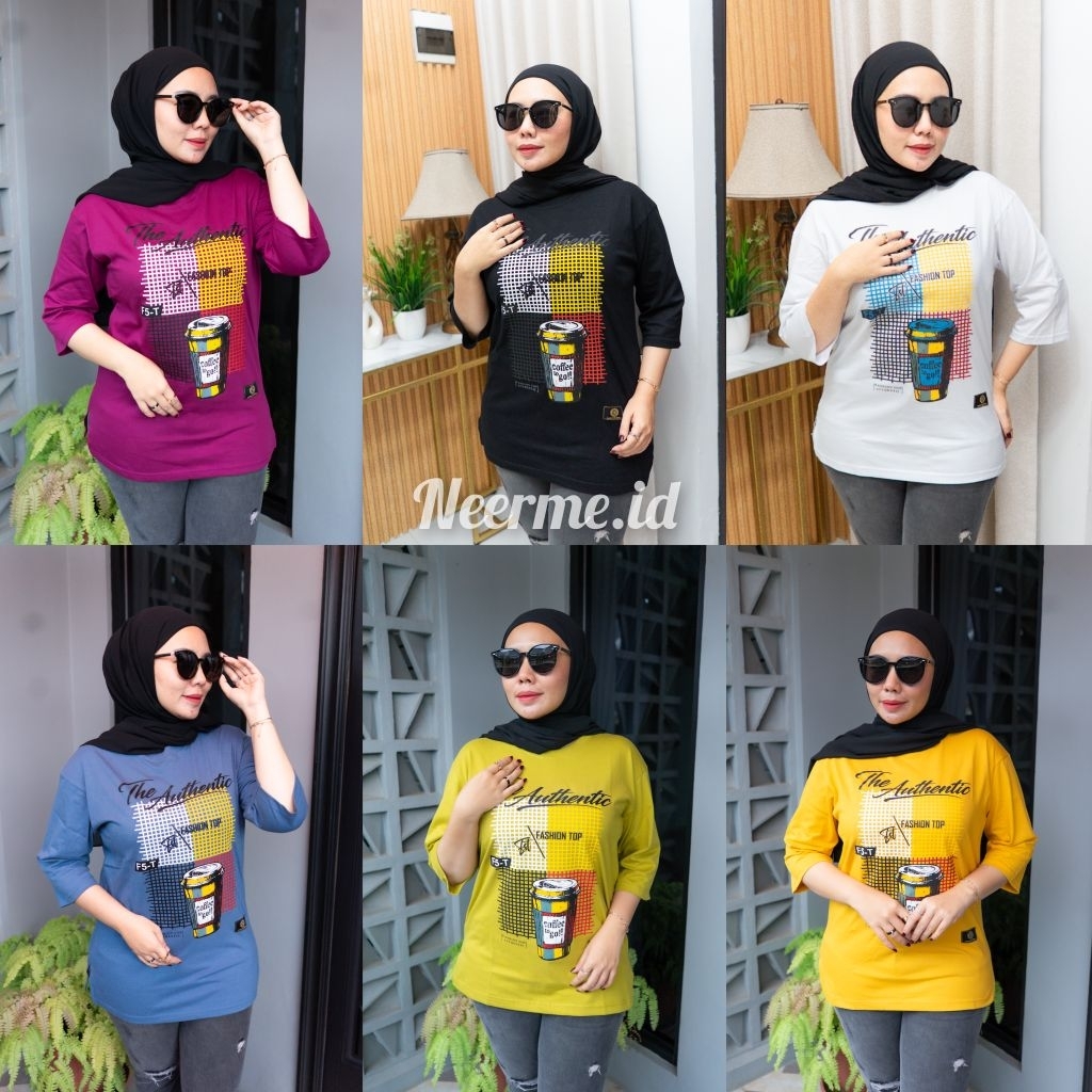 Neerme.id- New Atasan Kaos T-shirt Wanita Oversize Motif coffee Lengan 7/8
