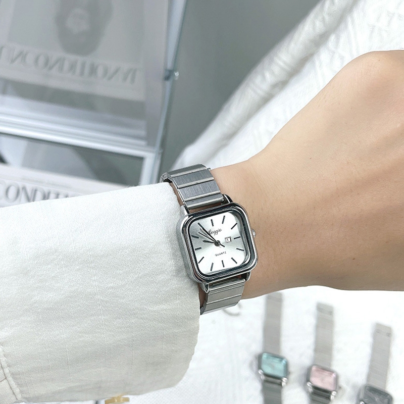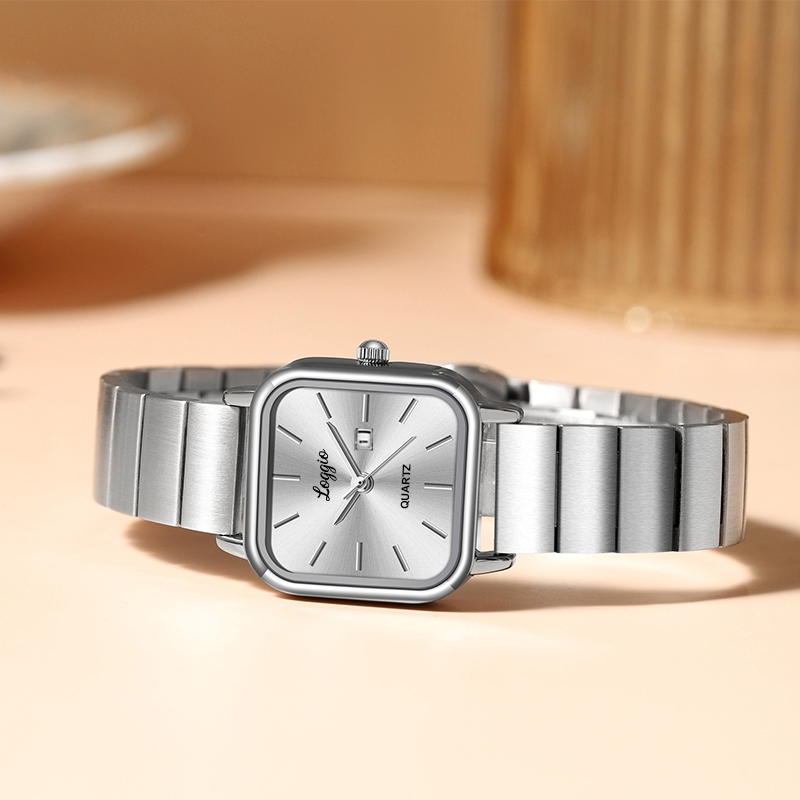 Jam Tangan Wanita Loggio Kecil Analog Stainless Steel Dial Kotak Simpel Modern Tali Rantai