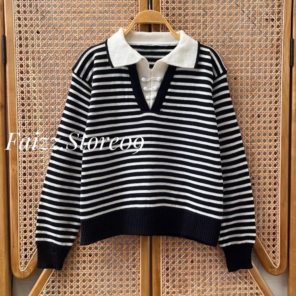 Paula Knits - Atasan Sweater Rajut Wanita Berkerah Polo Motif Stripe Kekinian Korean Style Premium