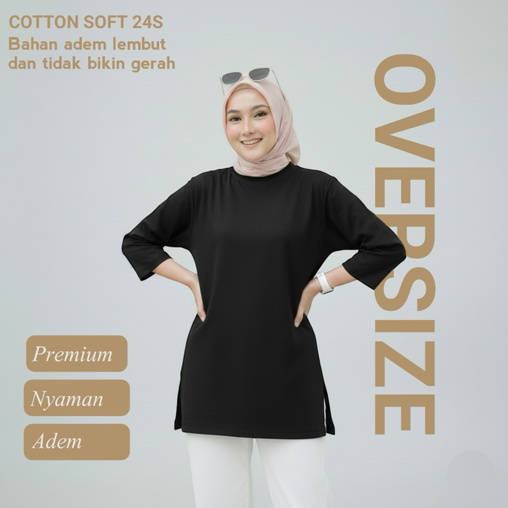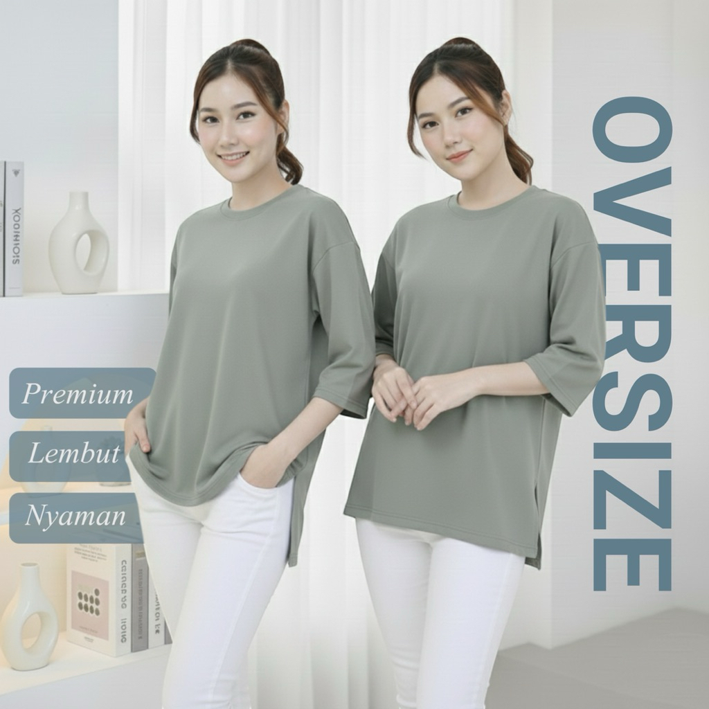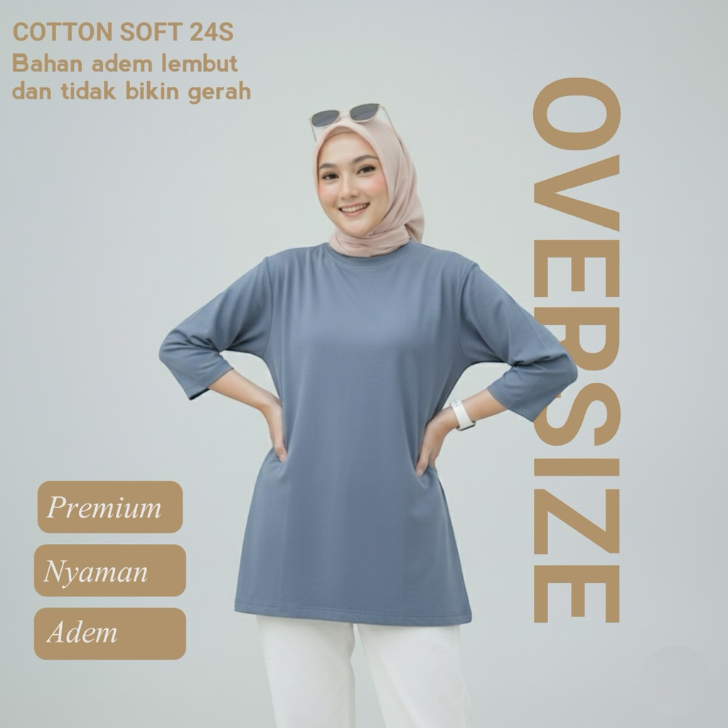 Kaos Oversize Wanita Lengan 7/8 Cotton Soft 24s Premium - T-Shirt Atasan Polos Adem Lembut