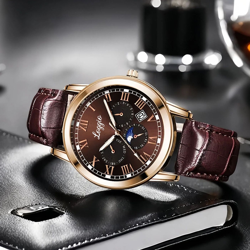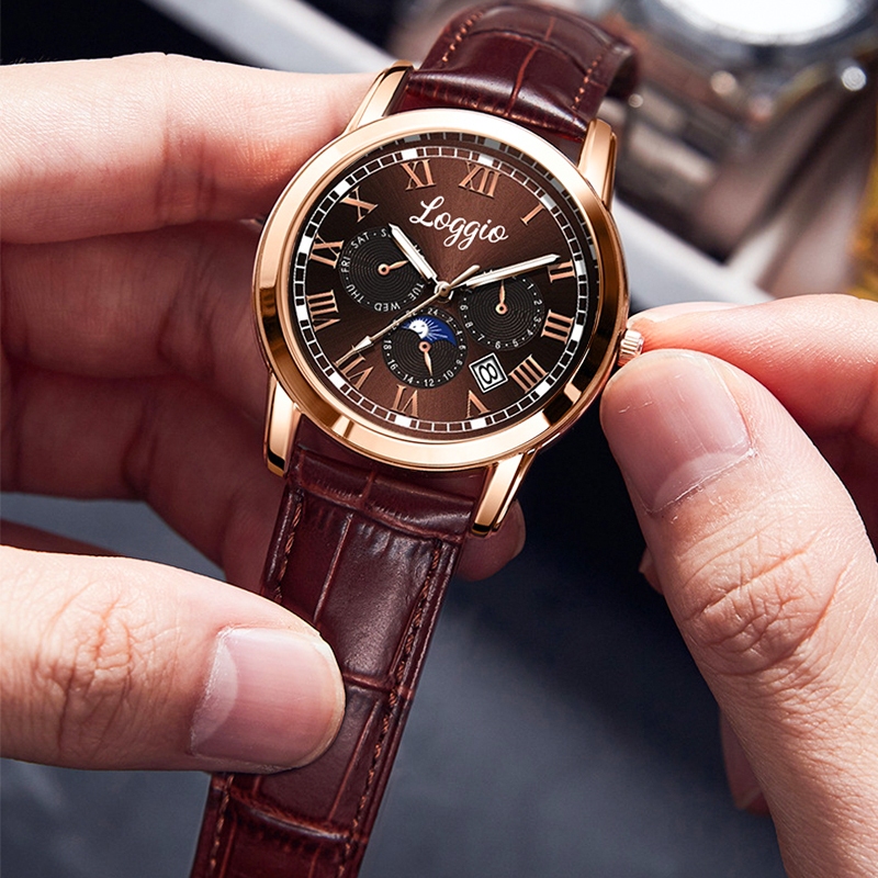 Jam Tangan Cowok Loggio Kalender Tahan Air Kuarsa Santai Bisnis Tali Kulit