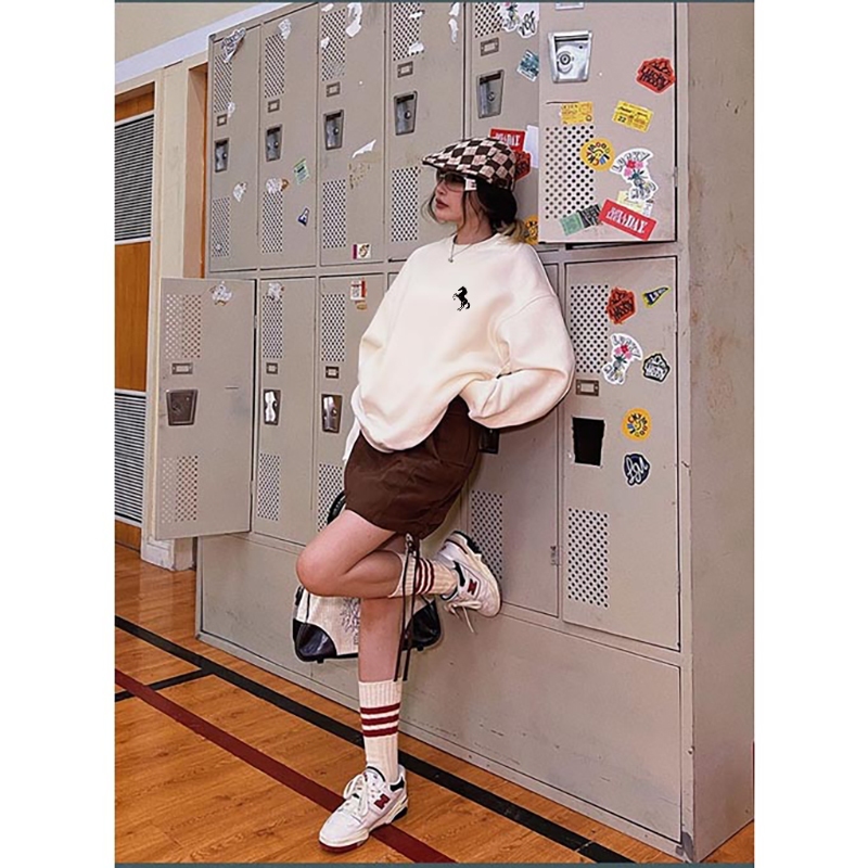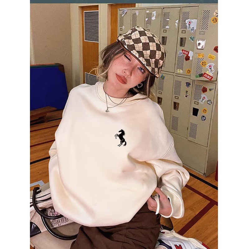 MONSEUR Sweater Lengan Panjang Wanita Gaya Korea Dengan Motif Ikon Kuda Poni Dan Kerah Bulat/ Cewek Switer Wanita Longsl