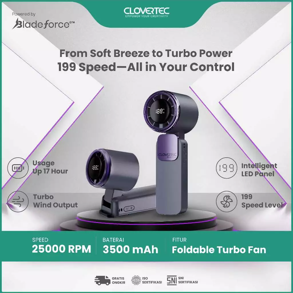 CLOVERTEC CHF-03B Kipas Angin Mini Lipat Portable Handheld Fan Turbo Rechargeable 3500 mAh GARANSI RESMI