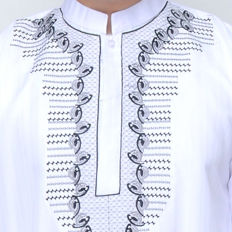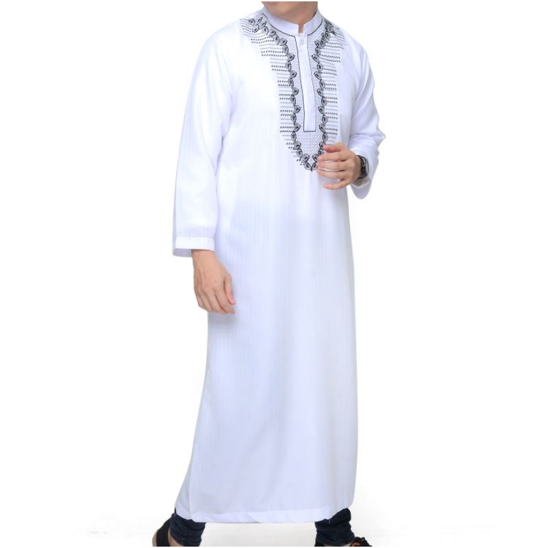 Gamis Jubah Pria Putih Lengan Panjang Bordir Dada Benang Hitam